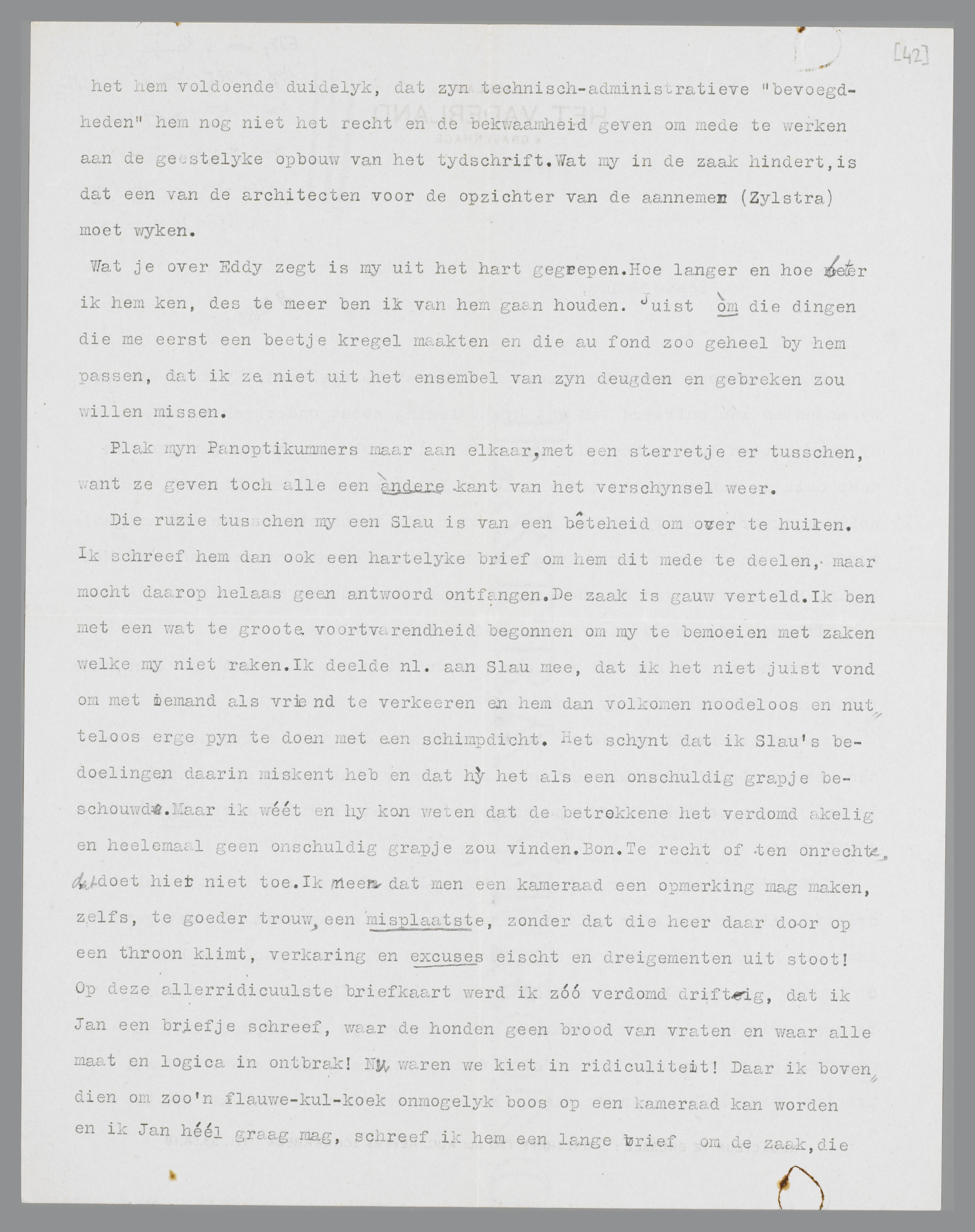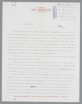 Wat je schreef over het geval Forum-Eddy-Bouws vind ik toch wel verdrietig. Als de minister valt op een principieele quaestie is dat gewoon, maar als hij moet aftreden wegens oneenigheid of liever incompatabilité d'humeur met een referendaris, vind ik dat tegen alles. Ik zou dan liever de referendaris aan den dijk, of althans op zijn nummer, zetten. Niet nauwkeurig op de hoogte van de situatie zijnde vraag ik: Is Everard wel precies op de hoogte van de plaats welke hij in ‘Forum’ inneemt? En is het hem voldoende duidelijk, dat zijn technisch-administratieve ‘bevoegdheden’ hem nog niet het recht en de bekwaamheid geven om mede te werken aan de geestelijke opbouw van het tijdschrift. Wat mij in de zaak hindert, is dat een van de architecten voor de opzichter van de aannemer (Zijlstra) moet wijken.