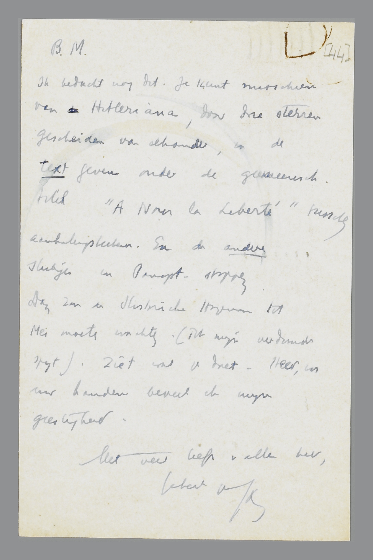 Ik bedacht nog dit. Je kunt misschien van de Hitleriana, door drie sterren gescheiden van elkander, de text geven onder de gemeensch. titel ‘A Nous la Liberté’ tusschen aanhalingsteekens. En de andere stukjes in Panopt. stoppen. Dan zou de Historische Hagenaar tot Mei moeten wachten (tot mijn verdomde spijt). Ziet wat U doet - Heer, in Uw handen beveel ik mijn geestelijkheid.
