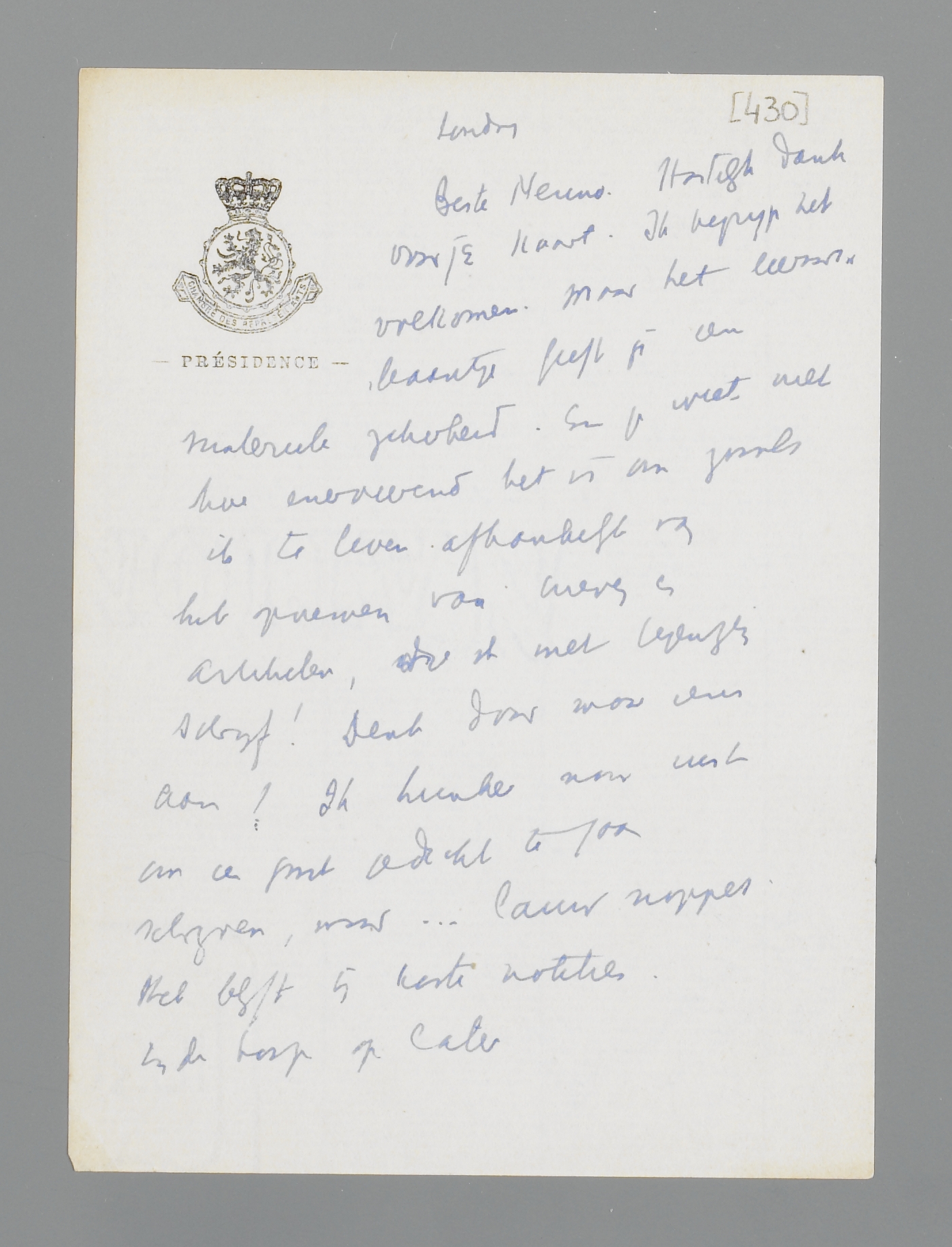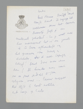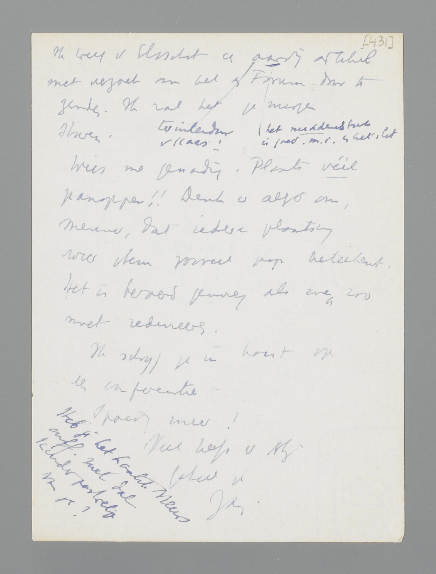 Hartelijk dank voor je kaart. Ik begrijp het volkomen. Maar het leraarsbaantje geeft je een materiële zekerheid. En je weet niet hoe enerverend het is om zooals ik te leven afhankelijk van het opnemen van brieven en artikelen, die ik met tegenzin schrijf! Denk daar maar eens aan! Ik hunker naar rust om een groot gedicht te gaan schrijven, maar... lauw noppes. Het blijft bij korte notities. In de hoop op later.