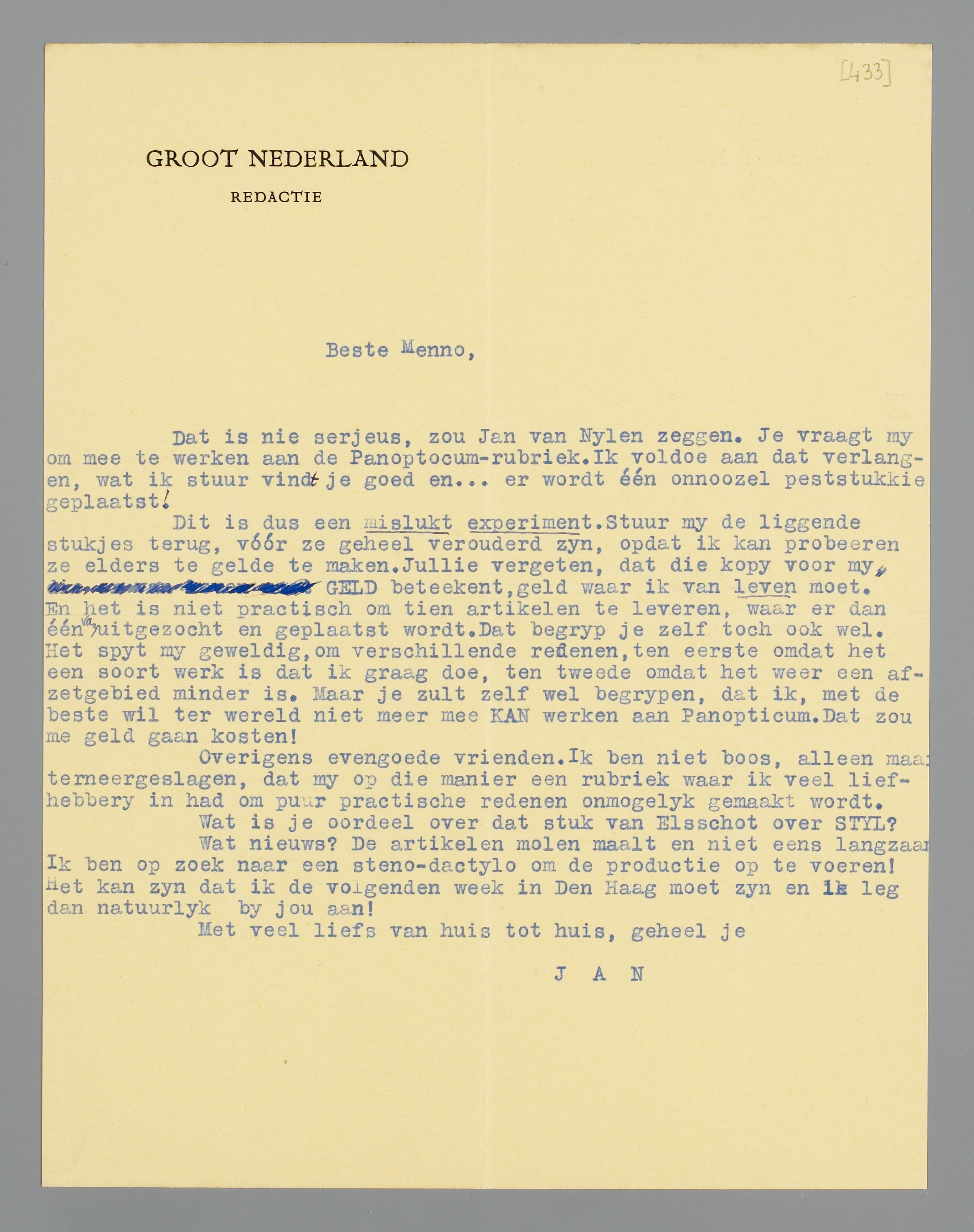 Dit is dus een mislukt experiment. Stuur mij de liggende stukjes terug, vóór ze geheel verouderd zijn, opdat ik kan probeeren ze elders te gelde te maken. Jullie vergeten, dat die kopy voor mij GELD beteekent, geld waar ik van leven moet. En het is niet practisch om tien artikelen te leveren, waar er dan één van uitgezocht en geplaatst wordt. Dat begrijp je zelf toch ook wel. Het spijt mij geweldig, om verschillende redenen, ten eerste omdat het een soort werk is dat ik graag doe, ten tweede omdat het weer een afzetgebied minder is. Maar je zult zelf wel begrijpen, dat ik, met de beste wil ter wereld niet meer mee KAN werken aan Panopticum. Dat zou me geld gaan kosten!