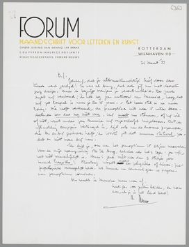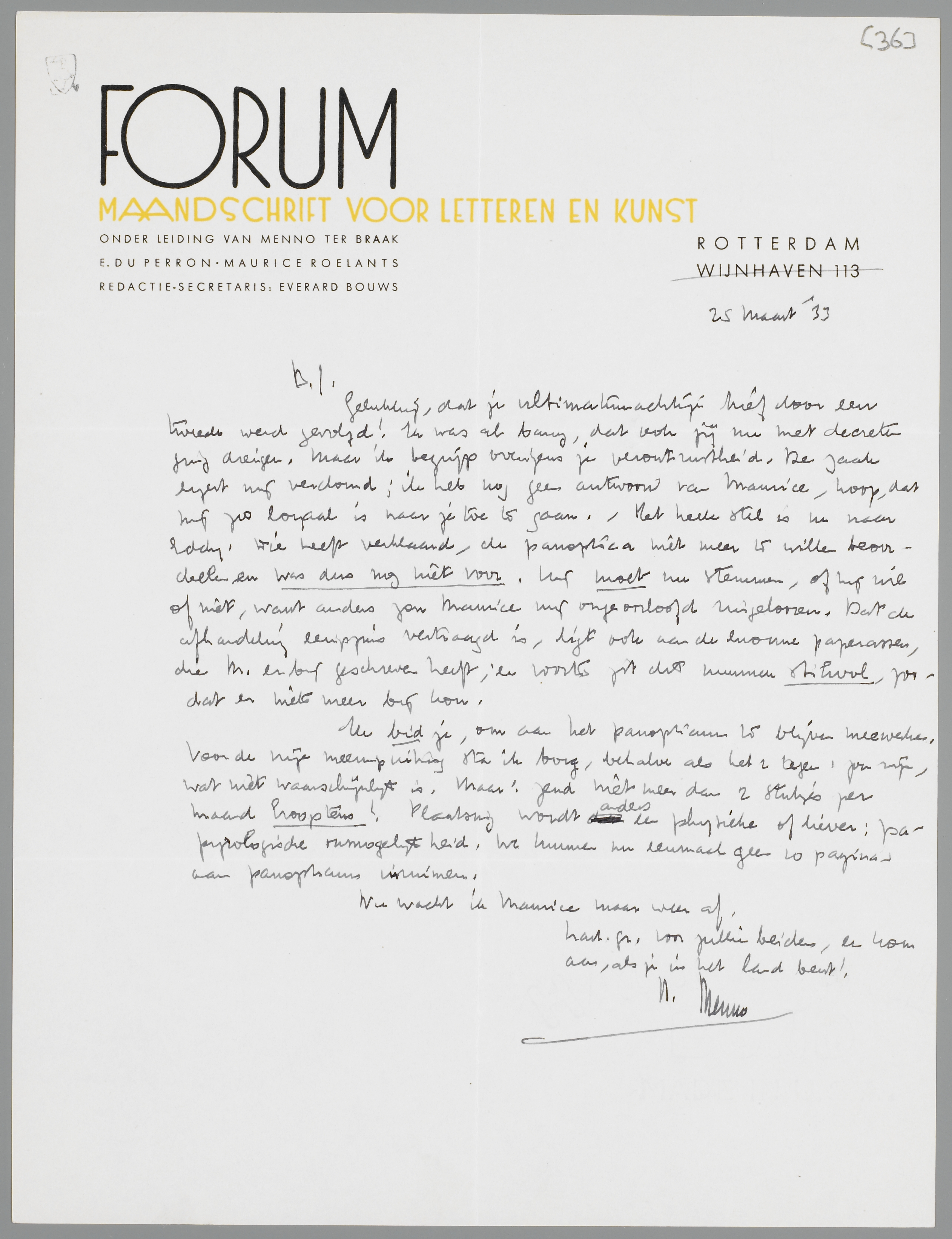 Gelukkig, dat je ultimatumachtige brief door een tweede werd gevolgd! Ik was al bang, dat ook jij nu met decreten ging dreigen. Maar ik begrijp overigens je verontrustheid. De zaak ergert mij verdomd; ik heb nog geen antwoord van Maurice, hoop, dat hij zoo loyaal is naar je toe te gaan. - Het heele stel is nu naar Eddy. Die heeft verklaard, de panoptica niet meer te willen beoordeelen en was dus nog niet voor. Hij moet nu stemmen, of hij wil of niet, want anders zou Maurice mij ongeoorloofd ringelooren. Dat de afhandeling eenigszins vertraagd is, ligt ook aan de enorme paperassen, die M. er bij geschreven heeft; en voorts zit dit nummer stikvol, zoodat er niets meer bij kon.