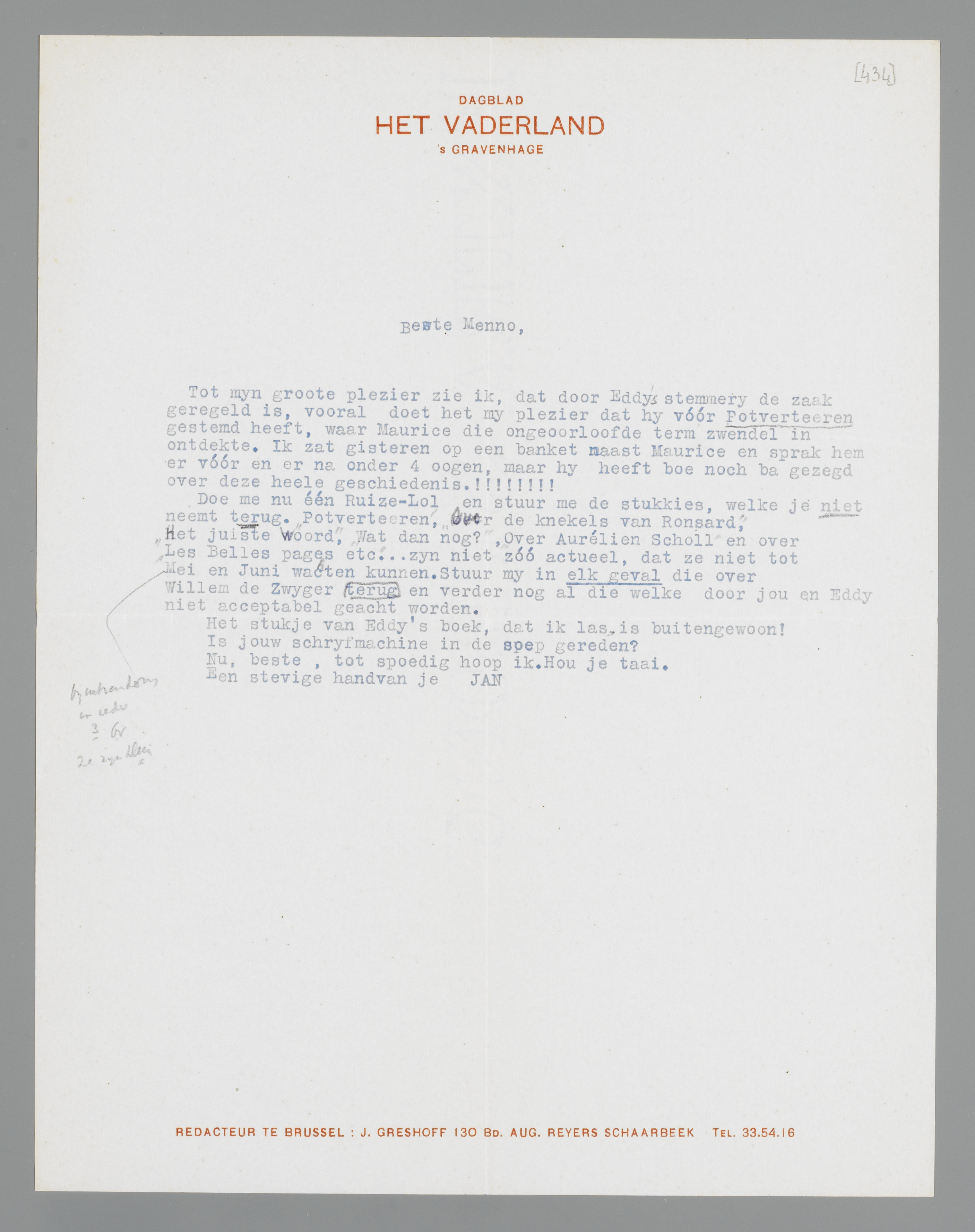 Doe me nu één Reuze-Lol en stuur me de stukkies, welke je niet neemt terug. ‘Potverteeren’, ‘Over de knekels van Ronsard’, ‘Het juiste Woord’, ‘Wat dan nog?’, ‘Over Aurélien Scholl’ en over ‘Les Belles pages etc’... zijn niet zóó actueel, dat ze niet tot (bijeenhouden en in ieder 3 bv. ze zijn klein) Mei en Juni wachten kunnen. Stuur mij in elk geval die over Willem de Zwijger terug en verder nog al die welke door jou en Eddy niet acceptabel geacht worden.