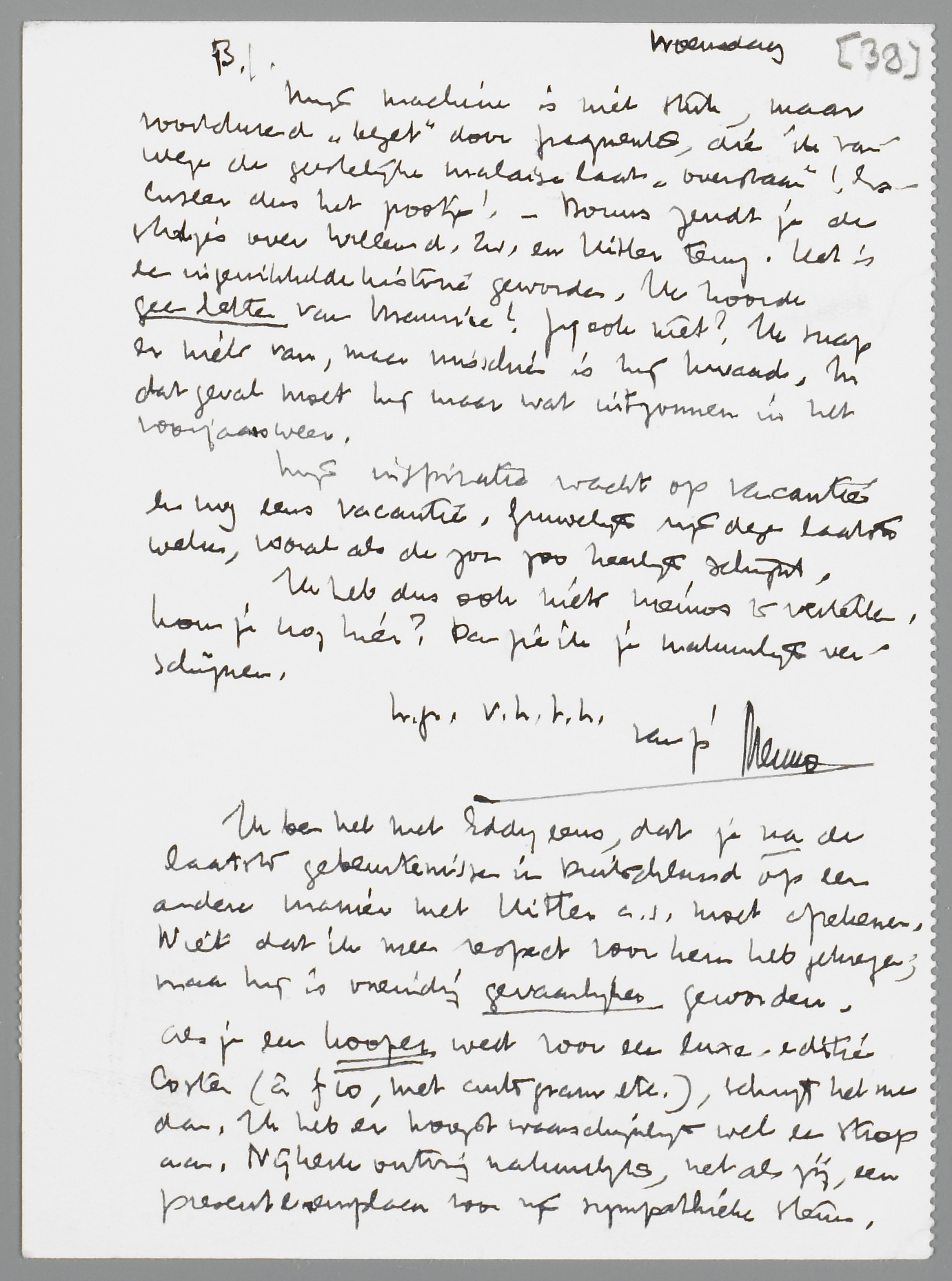 Mijn machine is niet stuk, maar voortdurend ‘bezet’ door fragmenten, die ik vanwege de geestelijke malaise laat ‘overslaan’! Excuseer dus het pootje! - Bouws zendt je de stukjes over Willem d. Zw. en Hitler terug. Het is een ingewikkelde historie geworden. Ik hoorde geen letter van Maurice! Jij ook niet? Ik snap er niets van, maar misschien is hij kwaad. In dat geval moet hij maar wat uitzonnen in het voorjaarsweer.