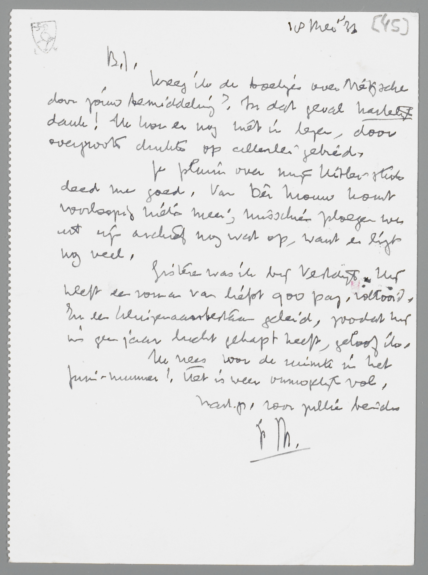 Kreeg ik de boekjes over Nietzsche door jouw bemiddeling? In dat geval hartelijk dank! Ik kon er nog niet in lezen, door overgroote drukte op allerlei gebied.