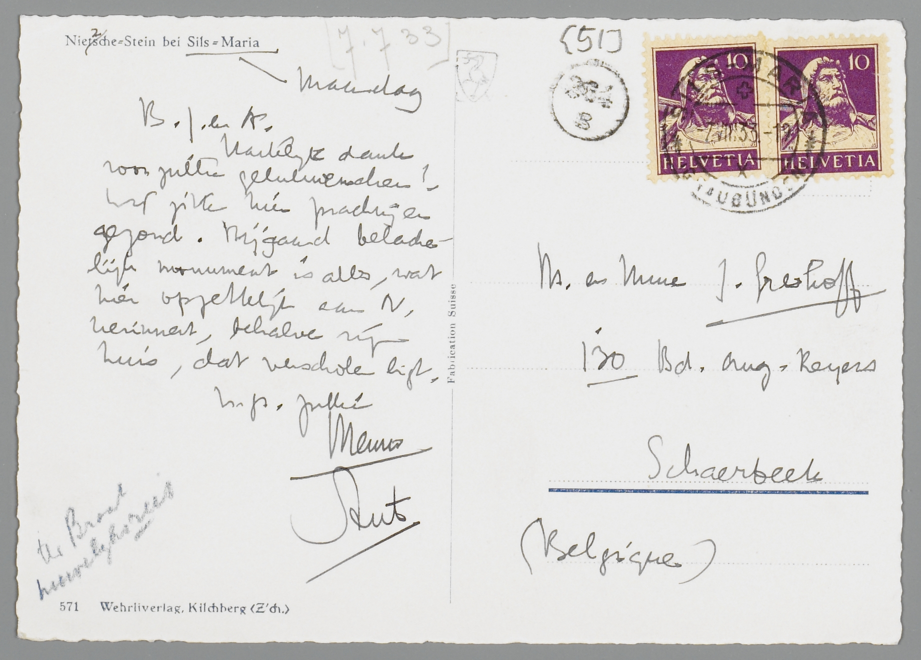 Hartelijk dank voor jullie gelukwenschen! Wij zitten hier prachtig en gezond. Bijgaand belachelijk monument is alles, wat hier opzettelijk aan N. herinnert, behalve zijn huis, dat verscholen ligt.