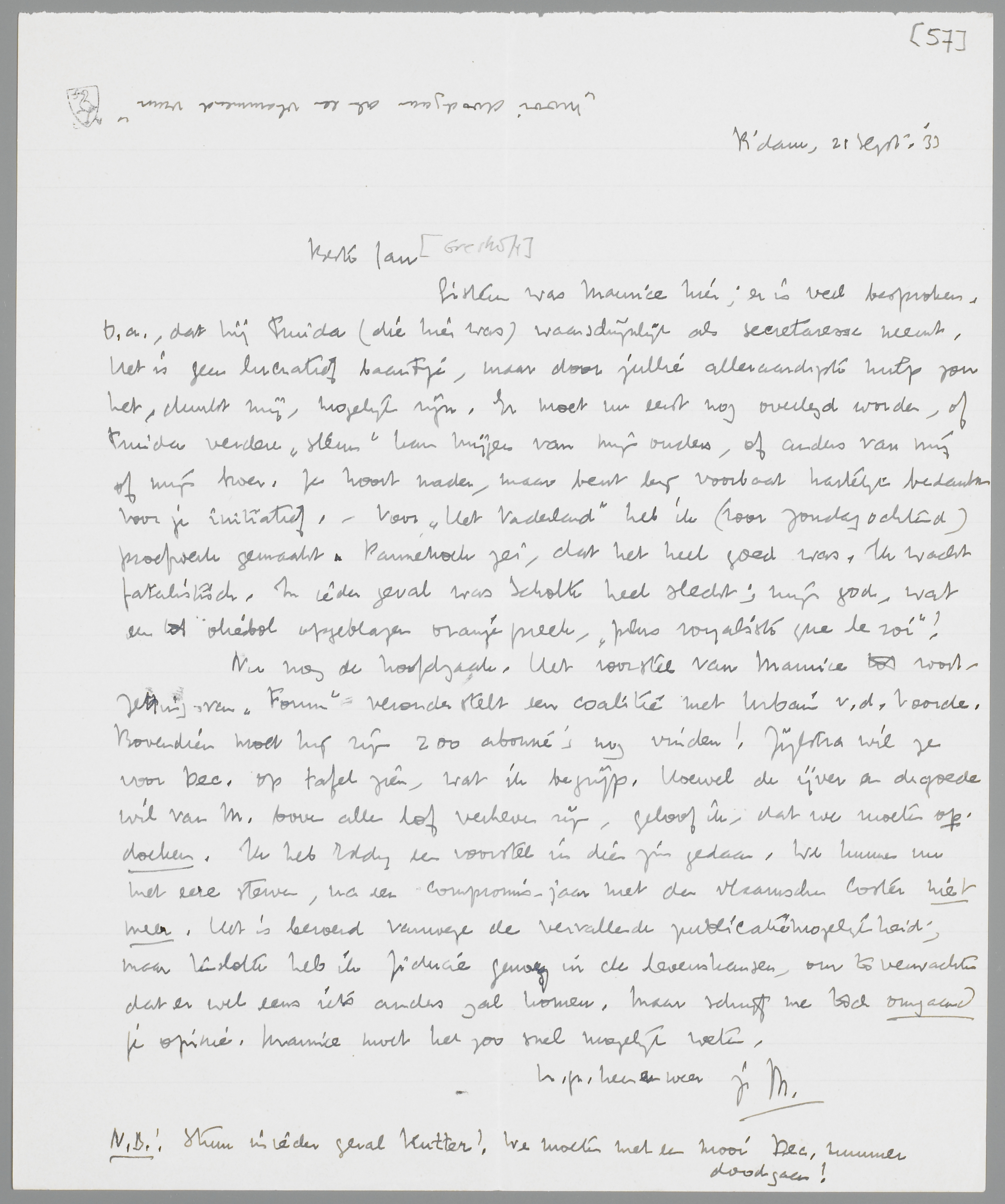 Nu nog de hoofdzaak. Het voorstel van Maurice tot voortzetting van ‘Forum’ veronderstelt een coalitie met Urbain v.d.Voorde. Bovendien moet hij zijn 200 abonné's nog vinden! Zijlstra wil ze voor Dec. op tafel zien, wat ik begrijp. Hoewel de ijver en de goede wil van M. boven alle lof verheven zijn, geloof ik, dat we moeten opdoeken. Ik heb Eddy een voorstel in dien zin gedaan. We kunnen nu met eere sterven, na een compromis-jaar met den Vlaamschen Coster niet meer. Het is beroerd vanwege de vervallende publicatiemogelijkheid; maar tenslotte heb ik fiducie genoeg in de levenskansen, om te verwachten dat er wel eens iets anders zal komen. Maar schrijf me toch omgaand je opinie. Maurice moet het zoo snel mogelijk weten.