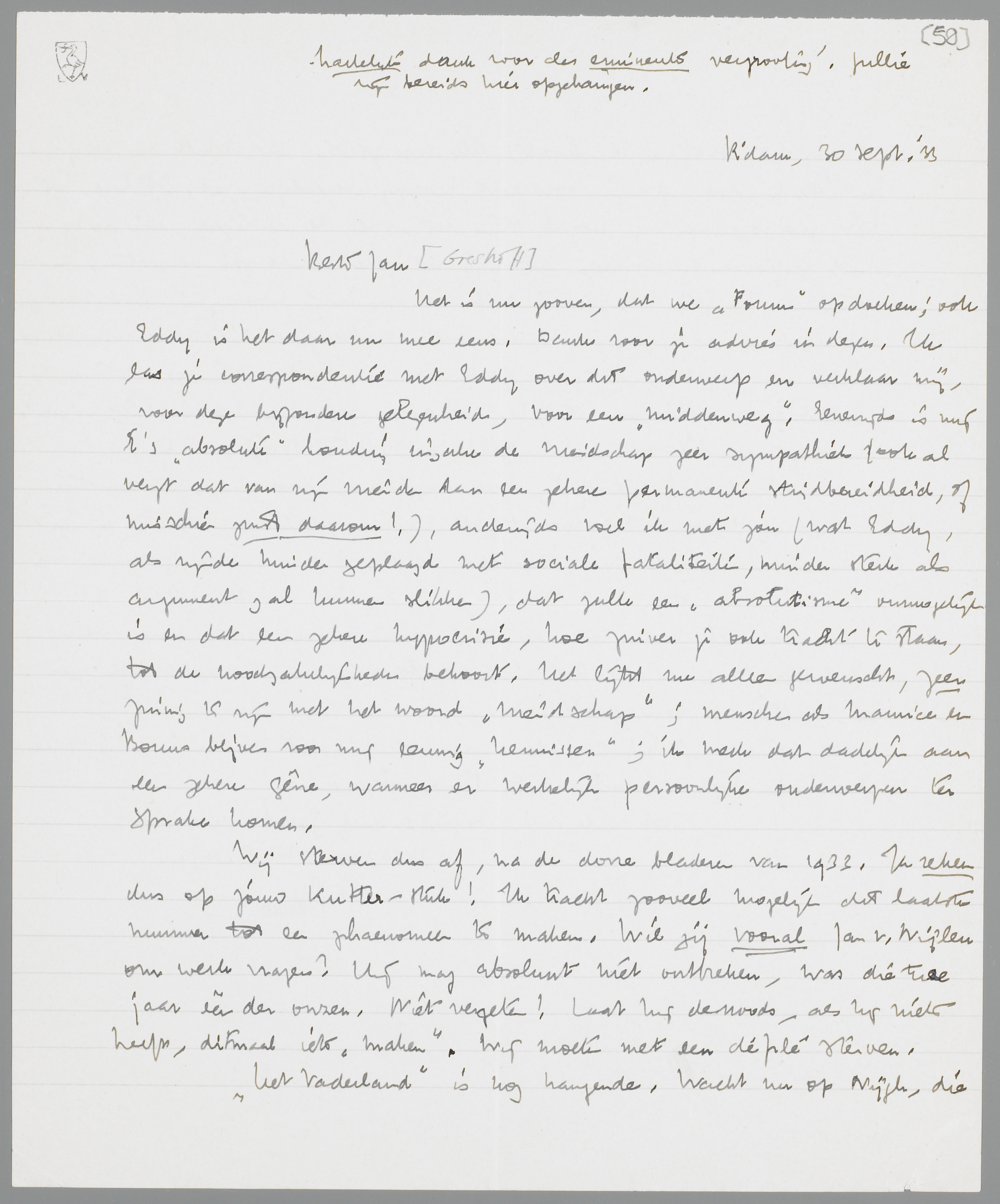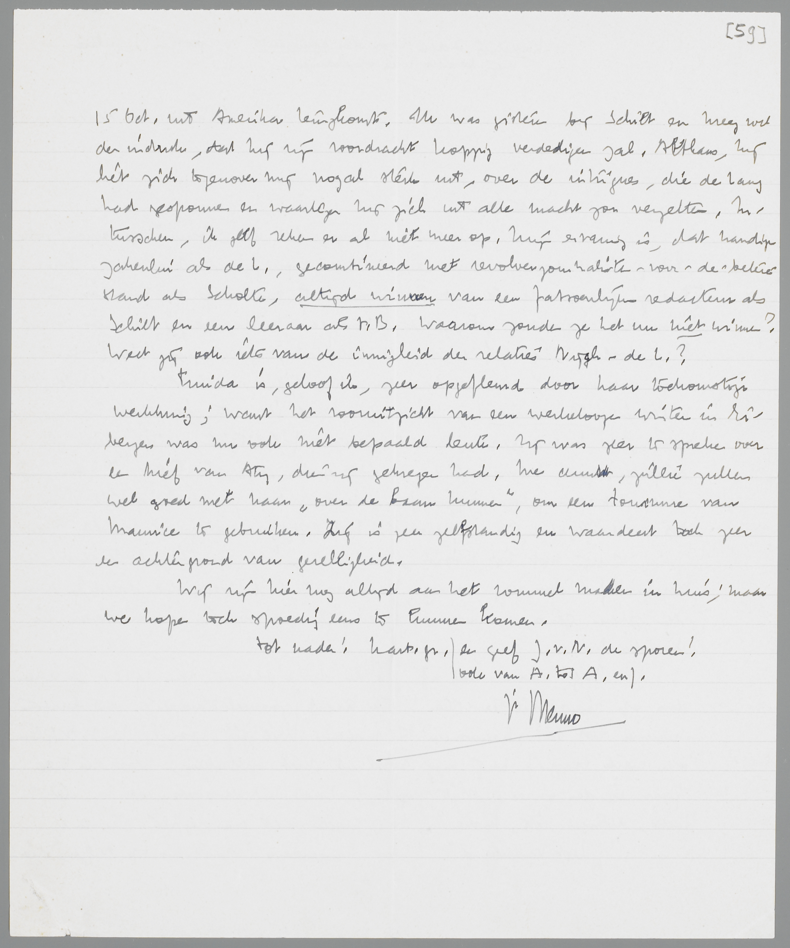 Het is nu zoover, dat we ‘Forum’ opdoeken; ook Eddy is het daar nu mee eens. Dank voor je advies in dezen. Ik las je correspondentie met Eddy over dit onderwerp en verklaar mij, voor deze bijzondere gelegenheid, voor een ‘middenweg’. Eenerzijds is mij E's ‘absolute’ houding inzake de vriendschap zeer sympathiek (ook al vergt dat van zijn vrienden dan een zekere permanente strijdbereidheid, of misschien juist daarom!), anderzijds voel ik met jou (wat Eddy, als zijnde minder geplaagd met sociale fataliteiten, minder sterk als argument zal kunnen slikken), dat zulk een ‘absolutisme’ onmogelijk is en dat een zekere hypocrisie, hoe zuiver je ook tracht te staan, tot de noodzakelijkheden behoort. Het lijkt me alleen gewenscht, zeer zuinig te zijn met het woord ‘vriendschap’; menschen als Maurice en Bouws blijven voor mij eeuwig ‘kennissen’; ik merk dat dadelijk aan een zekere gêne, wanneer er werkelijk persoonlijke onderwerpen ter sprake komen.