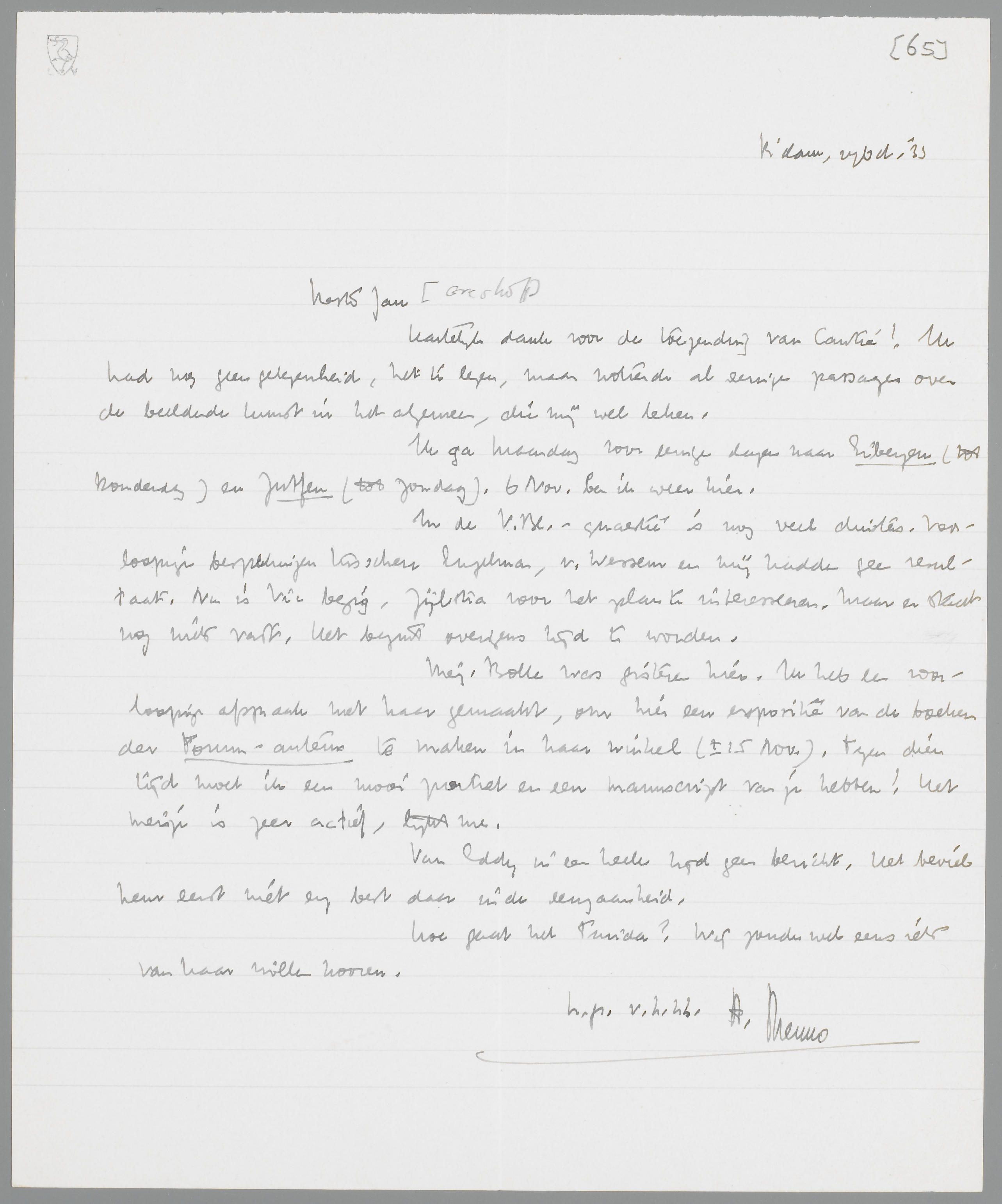 Mej. Bolle was gisteren hier. Ik heb een voorloopige afspraak met haar gemaakt, om hier een expositie van de boeken der Forum - auteurs te maken in haar winkel (± 15 Nov.). Tegen dien tijd moet ik een mooi portret en een manuscript van je hebben! Het meisje is zeer actief, lijkt me.
