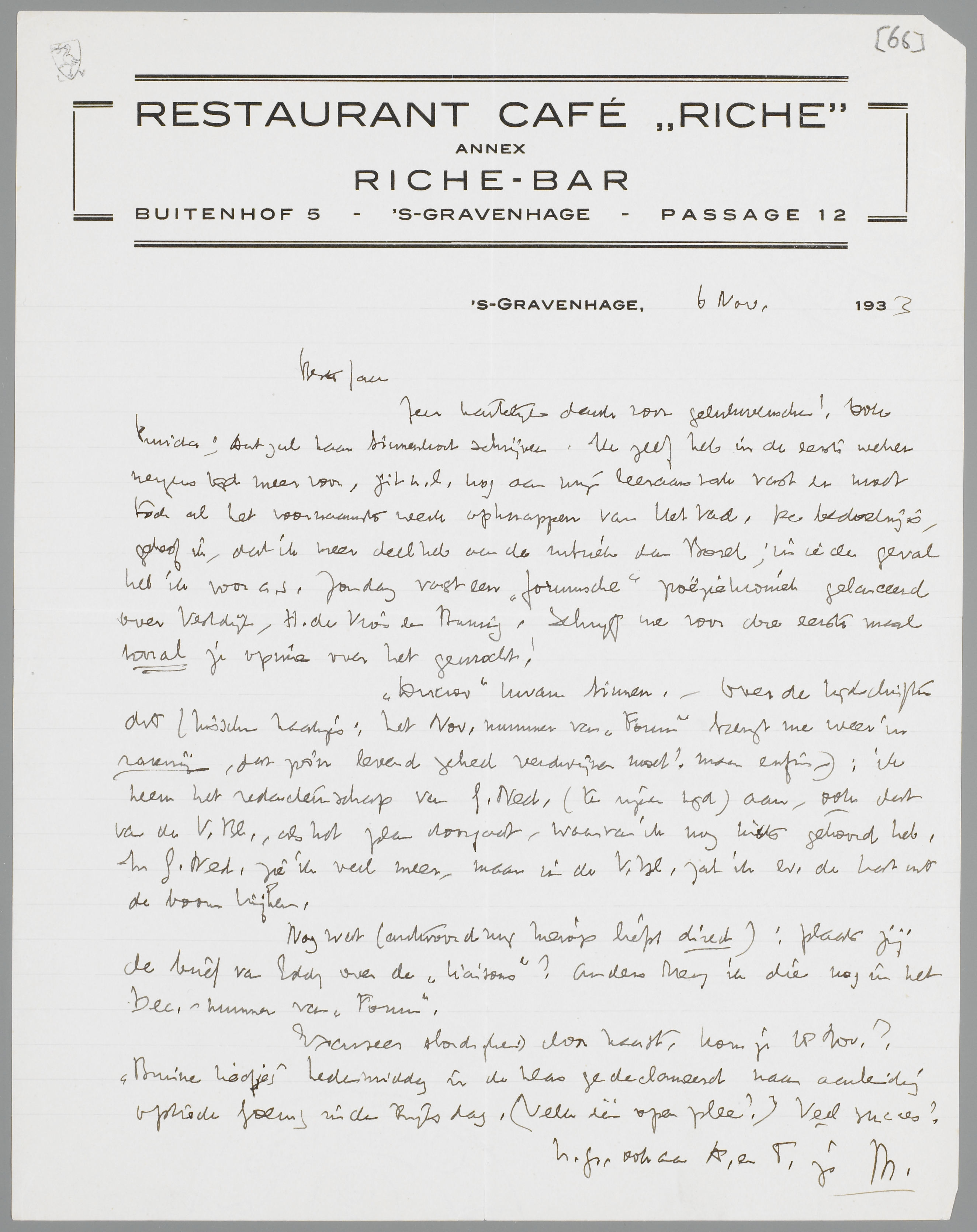 Nog wat (antwoord mij hierop liefst direct): plaats jij de brief van Eddy over de ‘liaisons’? Anders breng ik die nog in het Dec.-nummer van ‘Forum’.