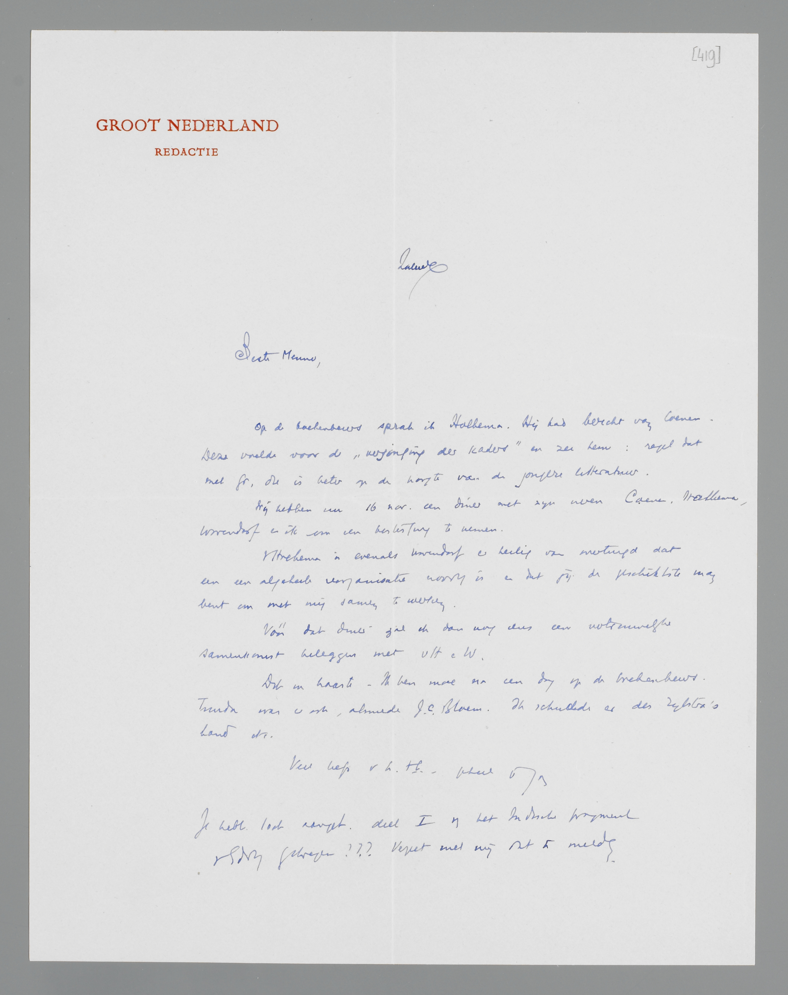 Op de boekenbeurs sprak ik Holkema. Hij had bericht van Coenen. Deze voelde voor de ‘verjonging des kaders’ en zei hem: regel dat met Gr, die is beter op de hoogte van de jongere litteratuur.