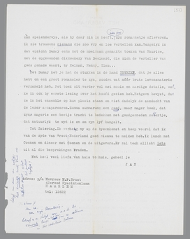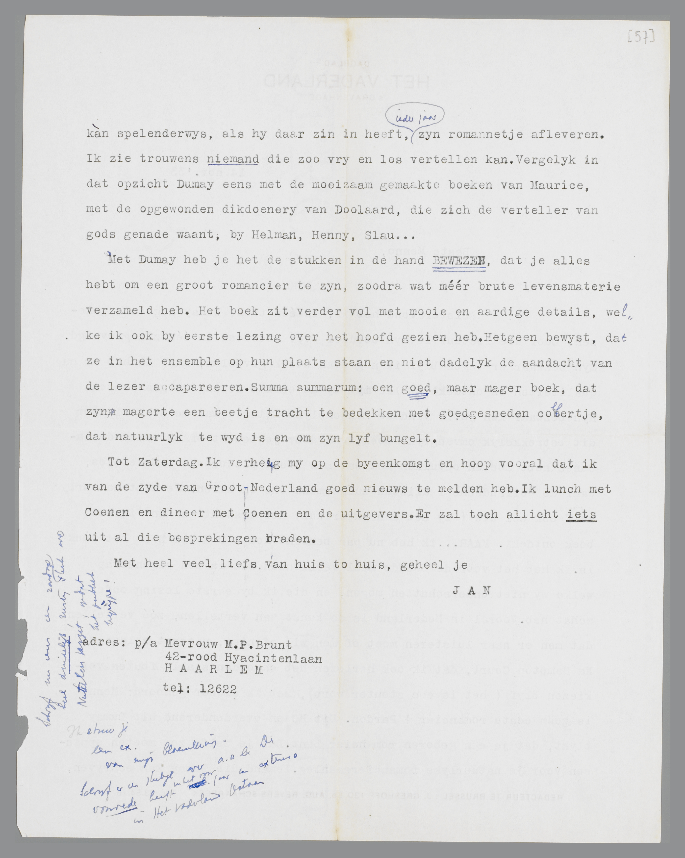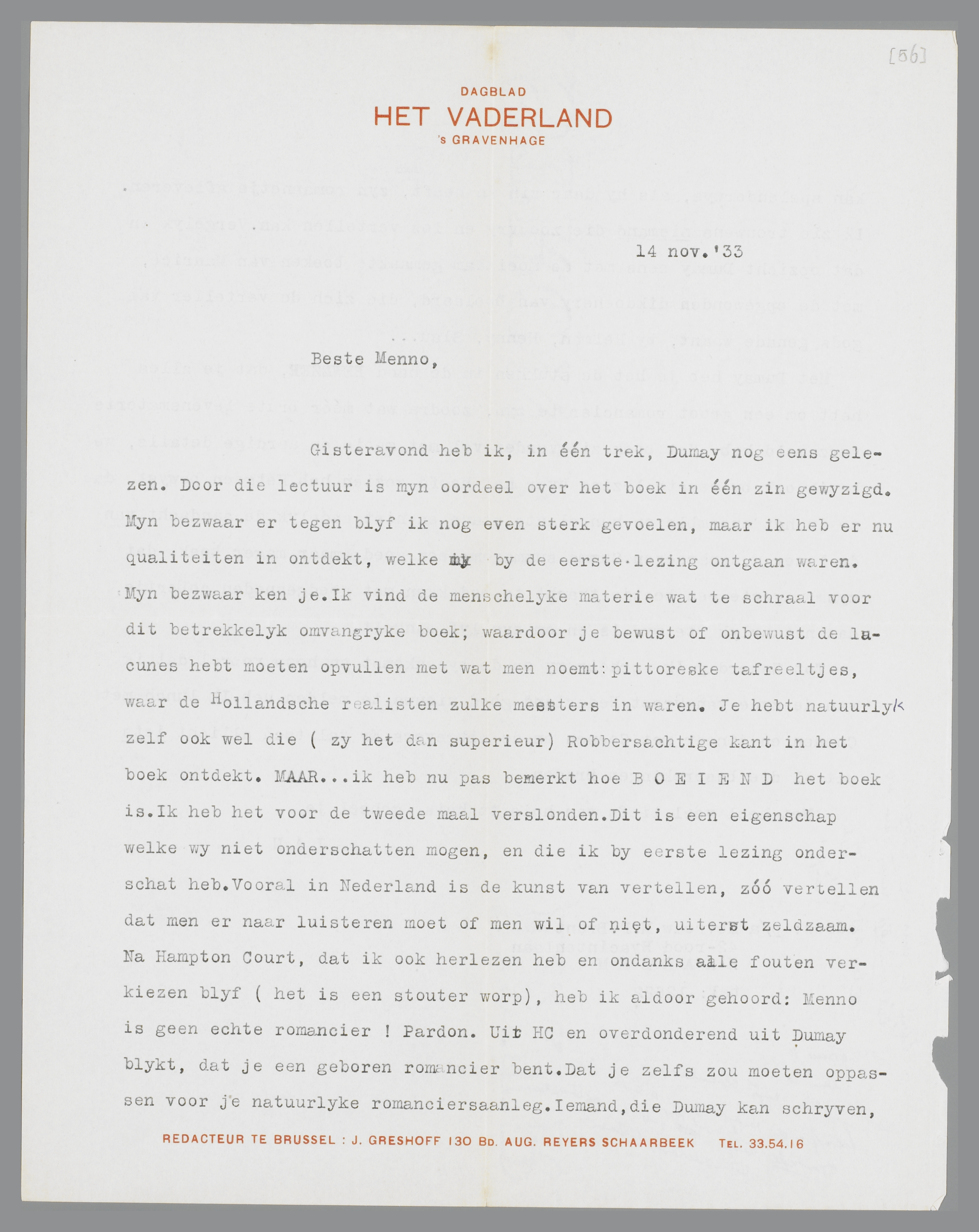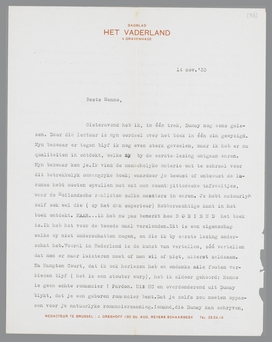 Gisteravond heb ik, in één trek, Dumay nog eens gelezen. Door die lectuur is mijn oordeel over het boek in één zin gewijzigd. Mijn bezwaar er tegen blijf ik nog even sterk gevoelen, maar ik heb er nu qualiteiten in ontdekt, welke mij bij de eerste lezing ontgaan waren. Mijn bezwaar ken je. Ik vind de menschelijke materie wat te schraal voor dit betrekkelijk omvangrijke boek; waardoor je bewust of onbewust de lacunes hebt moeten opvullen met wat men noemt: pittoreske tafreeltjes, waar de Hollandsche realisten zulke meesters in waren. Je hebt natuurlijk zelf ook wel die (zij het dan superieur) Robbersachtige kant in het boek ontdekt. MAAR...ik heb nu pas gemerkt hoe BOEIEND het boek is. Ik heb het voor de tweede maal verslonden. Dit is een eigenschap welke wij niet onderschatten mogen, en die ik bij eerste lezing onderschat heb. Vooral in Nederland is de kunst van vertellen, zóó vertellen dat men er naar luisteren moet of men wil of niet, uiterst zeldzaam. Na Hampton Court, dat ik ook herlezen heb en ondanks alle fouten verkiezen blijf (het is een stouter worp), heb ik aldoor gehoord: Menno is geen echte romancier! Pardon. Uit HC en overdonderend uit Dumay blijkt, dat je een geboren romancier bent. Dat je zelfs zou moeten oppassen voor je natuurlijke romanciersaanleg. Iemand, die Dumay kan schrijven, kàn spelenderwijs, als hij daar zin in heeft, ieder jaar zijn romannetje afleveren. Ik zie trouwens niemand die zoo vrij en los vertellen kan. Vergelijk in dat opzicht Dumay eens met de moeilijk gemaakte boeken van Maurice, met de opgewonden dikdoenderij van Doolaard, die zich de verteller van gods genade waant; bij Helman, Henny, Slau......