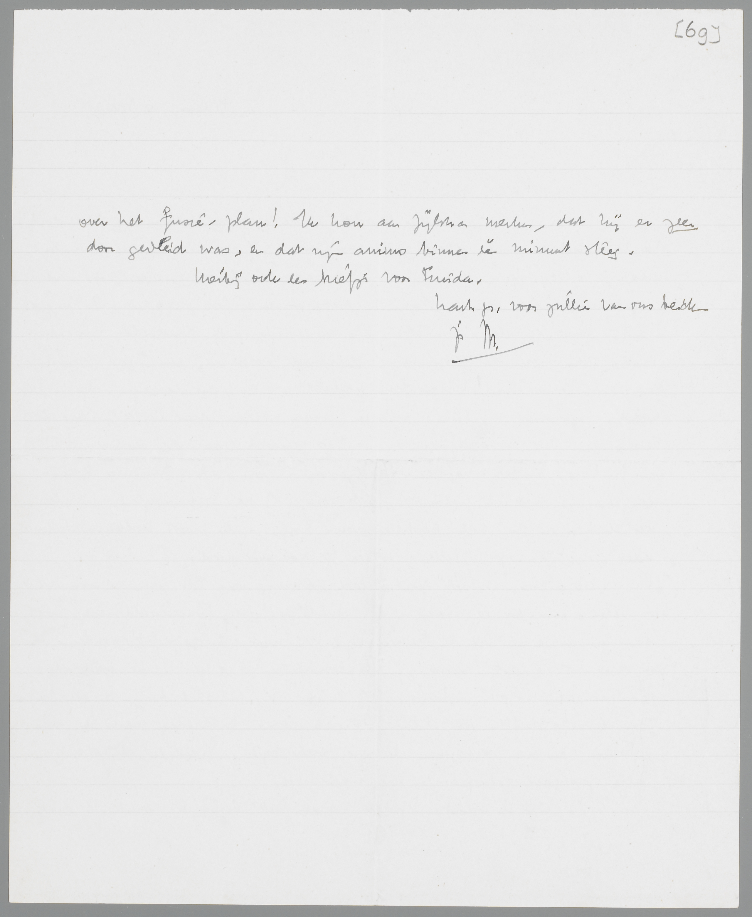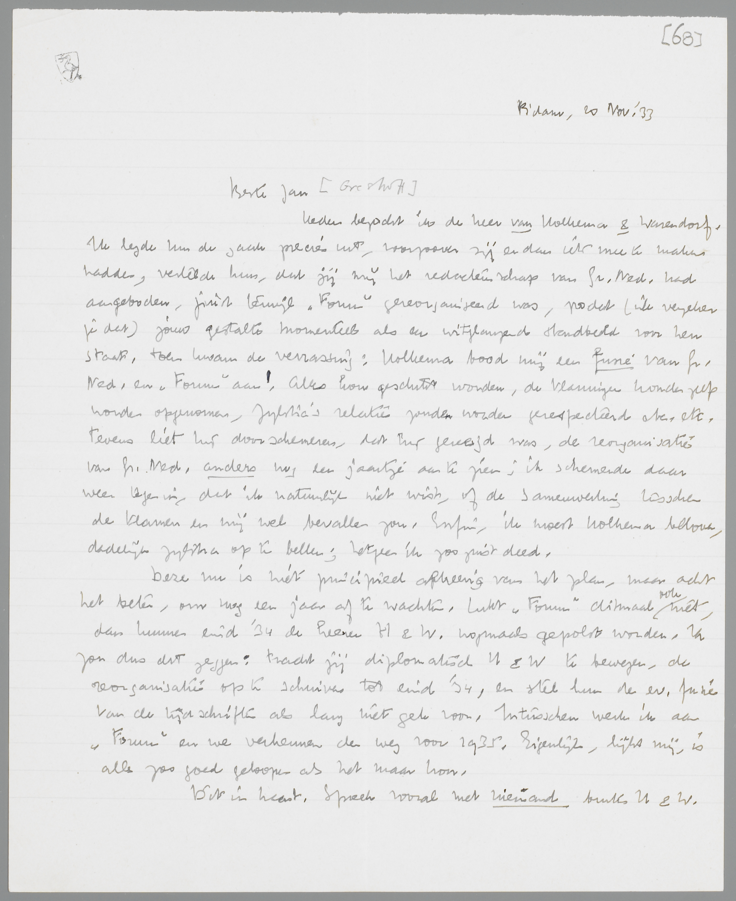 Heden bezocht ik de heer van Holkema & Warendorf. Ik legde hen de zaak precies uit, voorzoover zij er dan iets mee te maken hadden, vertelde hun, dat jij mij het redacteurschap van Gr.Ned. had aangeboden, juist terwijl ‘Forum’ gereorganiseerd was, zoodat (ik verzeker je dat) jouw gestalte momenteel als een witglanzend standbeeld voor hen staat. Toen kwam de verrassing: Holkema bood mij een fusie van Gr. Ned. en ‘Forum’ aan! Alles kon geschikt worden, de Vlamingen konden zelfs worden opgenomen, Zijlstra's relaties zouden worden gerespecteerd etc. etc. Tevens liet hij doorschemeren, dat hij geneigd was, de reorganisatie van Gr. Ned. anders nog een jaartje aan te zien; ik schemerde daar weer tegen in, dat ik natuurlijk niet wist, of de samenwerking tusschen de Vlamen en mij wel bevallen zou. Enfin, ik moest Holkema beloven, dadelijk Zijlstra op te bellen; hetgeen ik zoo juist deed.