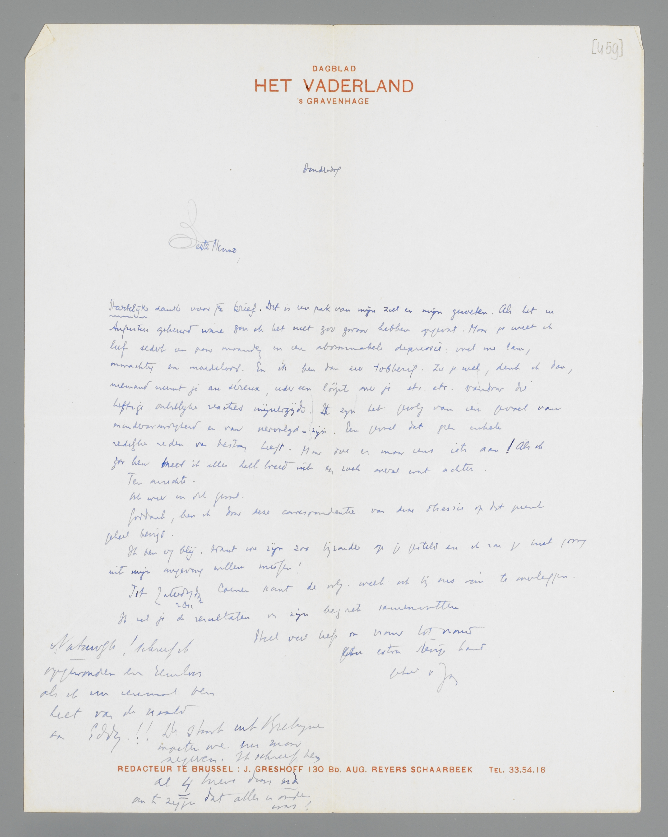 Hartelijk dank voor je brief. Dit is een pak van mijn ziel en mijn geweten. Als het in Augustus gebeurd ware zou ik het niet zoo zwaar hebben opgevat. Maar je weet ik leef sedert een paar maanden in een abominabele depressie: voel me lam, onmachtig en moedeloos. En ik ben dan zeer tobberig. Zie je wel, denk ik dan, niemand neemt je au sérieux, iedereen lóópt over je etc. etc. vandaar die heftige, onbillijke reacties mijnerzijds. Die zijn het gevolg van een gevoel van minderwaardigheid en vervolgd-zijn. Een gevoel dat geen enkele redelijke reden van bestaan heeft. Maar doe er maar eens iets aan! Als ik zoo ben meet ik alles heel breed uit en zoek overal wat achter.