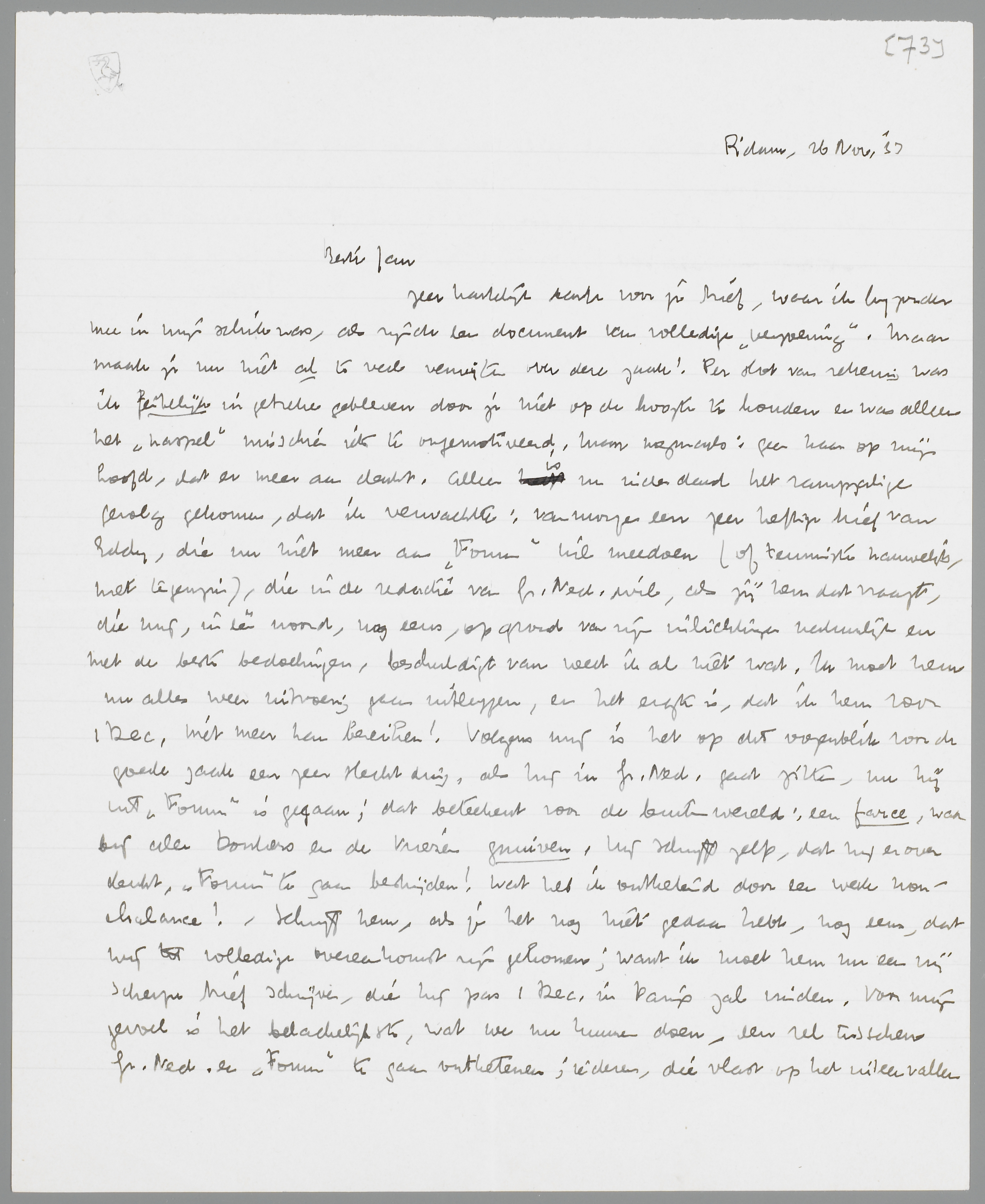 Zeer hartelijk dank voor je brief, waar ik bijzonder mee in mijn schik was, als zijnde een document van volledige ‘verzoening’. Maar maak je nu niet al te veel verwijten over deze zaak! Per slot van rekening was ik feitelijk in gebreke gebleven door je niet op de hoogte te houden en was alleen het ‘naspel’ misschien iets te ongemotiveerd. Maar nogmaals: geen haar op mijn hoofd, dat er meer aan denkt. Alleen is nu inderdaad het rampzalige gevolg gekomen, dat ik verwachtte: vanmorgen een zeer heftige brief van Eddy, die nu niet meer aan ‘Forum’ wil meedoen (of tenminste nauwelijks, met tegenzin), die in de redactie van Gr.Ned. wil, als jij hem dat vraagt, die mij, in één woord, nog eens, op grond van zijn inlichtingen natuurlijk en met de beste bedoelingen, beschuldigt van weet ik al niet wat. Ik moet hem nu alles weer uitvoerig gaan uitleggen, en het ergste is, dat ik hem voor 1 Dec. niet meer kan bereiken! Volgens mij is het op dit oogenblik voor de goede zaak een zeer slecht ding, als hij in Gr.Ned. gaat zitten, nu hij uit ‘Forum’ is gegaan; dat beteekent voor de buitenwereld: een farce, waarbij alle Donkers en de Vriezen gnuiven. Hij schrijft zelfs, dat hij er over denkt, ‘Forum’ te gaan bestrijden! Wat heb ik ontketend door een week nonchalance! - Schrijf hem, als je het nog niet gedaan hebt, nog eens, dat wij tot volledige overeenkomst zijn gekomen; want ik moet hem nu een vrij scherpe brief schrijven, die hij pas 1 Dec. in Parijs zal vinden. Voor mijn gevoel is het belachelijkste, wat we nu kunnen doen, een rel tusschen Gr.Ned. en ‘Forum’ te gaan ontketenen; iedereen, die vlast op het uiteenvallen van een bondgenootschap, zal zich verkneukelen over zooiets.