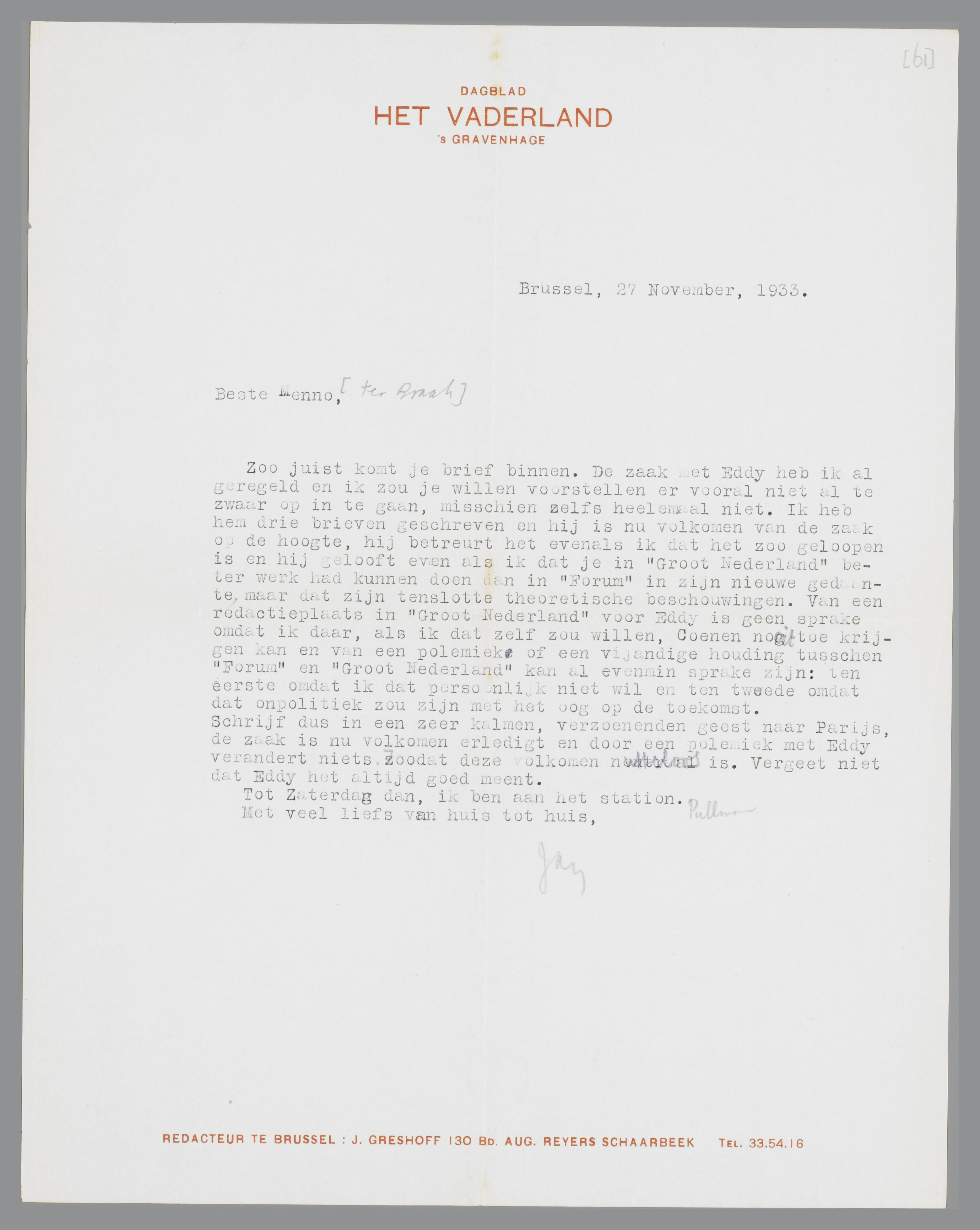 Zoo juist komt je brief binnen. De zaak met Eddy heb ik al geregeld en ik zou je willen voorstellen er vooral niet al te zwaar op in te gaan, misschien zelfs heelemaal niet. Ik heb hem drie brieven geschreven en hij is nu volkomen van de zaak op de hoogte, hij betreurt het evenals ik dat het zoo geloopen is en hij gelooft even als ik dat je in ‘Groot Nederland’ beter werk had kunnen doen dan in ‘Forum’ in zijn nieuwe gedaante, maar dat zijn tenslotte theoretische beschouwingen. Van een redactieplaats in ‘Groot Nederland’ voor Eddy is geen sprake omdat ik daar, als ik dat zelf zou willen, Coenen nooit toe krijgen kan en van een polemiek of een vijandige houding tusschen ‘Forum’ en ‘Groot Nederland’ kan al evenmin sprake zijn: ten eerste omdat ik dat persoonlijk niet wil en ten tweede omdat dat onpolitiek zou zijn met het oog op de toekomst.