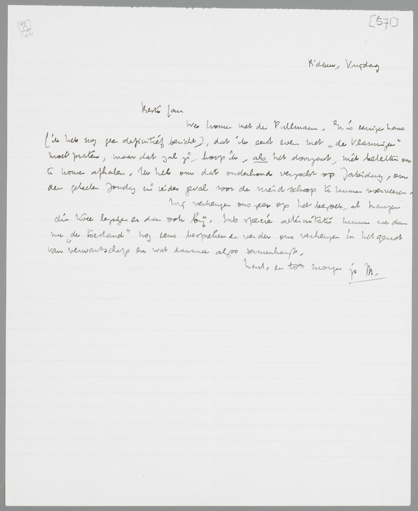 We komen met de Pullmann. Er is eenige kans (ik heb nog geen definitief bericht), dat ik eerst even met ‘de Vlamingen’ moet praten, maar dat zal je, hoop ik, als het doorgaat, niet beletten om te komen afhalen. Ik heb om dat onderhoud verzocht op Zaterdag, om den geheelen Zondag in ieder geval voor de vriendschap te kunnen reserveeren.