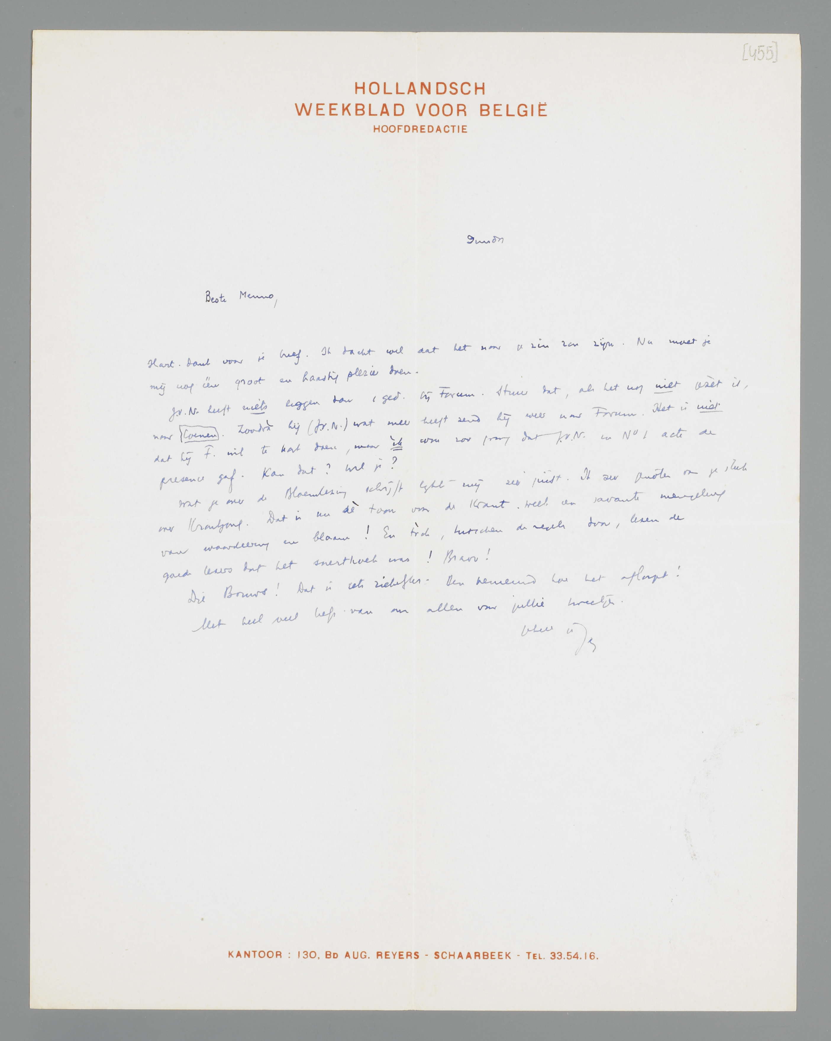 J.v.N. heeft niets liggen dan 1 ged. bij Forum. Stuur dat, als het nog niet gezèt is, naar Coenen. Zoodra hij (J.v.N.) wat meer heeft zend hij dat naar Forum. Het is niet dat hij F. wil te kort doen, maar ik wou zoo graag dat J.v.N. in No. 1 acte de presence gaf. Kan dat? Wil je?