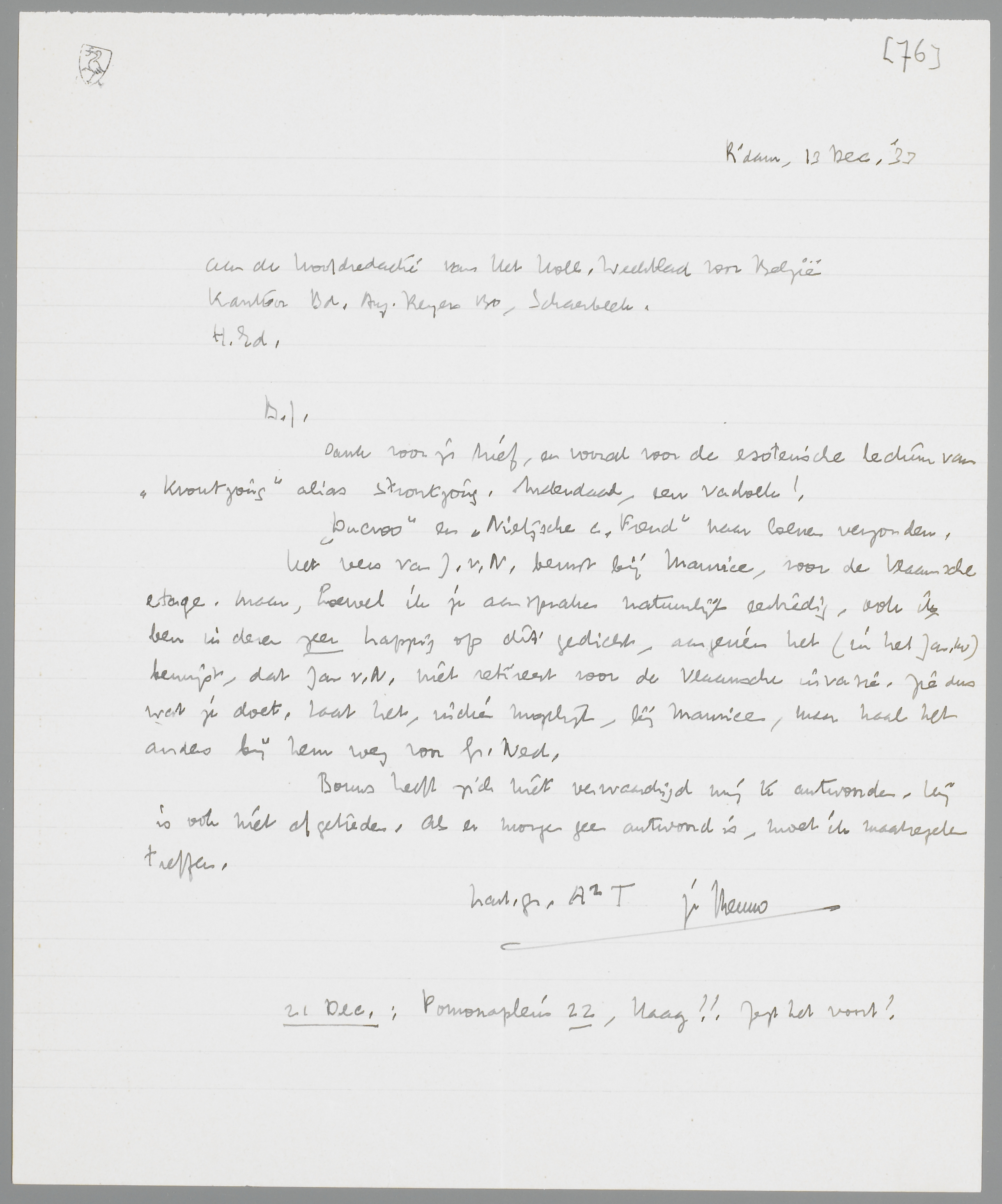 Het vers van J.v.N. berust bij Maurice, voor de Vlaamsche etage. Maar, hoewel ik je aanspraken natuurlijk eerbiedig, ook ik ben in dezen zeer happig op dit gedicht, aangezien het (in het Jan.no.) bewijst, dat Jan v.N. niet retireert voor de Vlaamsche invasie. Zie dus wat je doet, laat het, indien mogelijk, bij Maurice, maar haal het anders bij hem weg voor Gr. Ned.