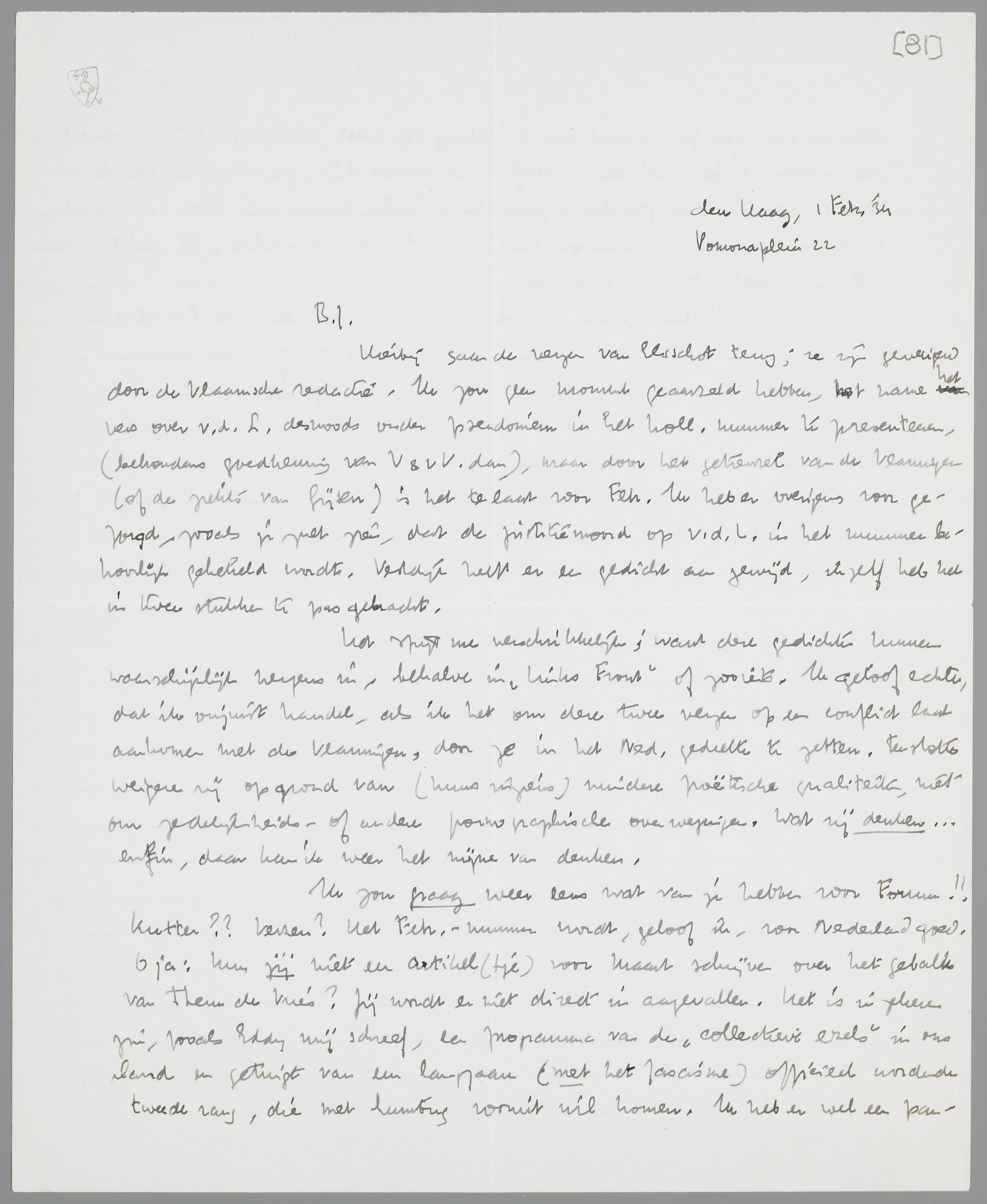 Hierbij gaan de verzen van Elsschot terug; ze zijn geweigerd door de Vlaamsche redactie. Ik zou geen moment geaarzeld hebben, met name het vers over v.d. L. desnoods onder pseudoniem in het holl. nummer te presenteeren, (behoudens goedkeuring van V.&v.V. dan), maar door het getreuzel van de Vlamingen (of de ziekte van Gijsen) is het te laat voor Febr. Ik heb er overigens voor gezorgd, zooals je zult zien, dat de justitiemoord op v.d. L. in het nummer behoorlijk gehekeld wordt. Vestdijk heeft er een gedicht aan gewijd, ik zelf heb het in twee stukken te pas gebracht.