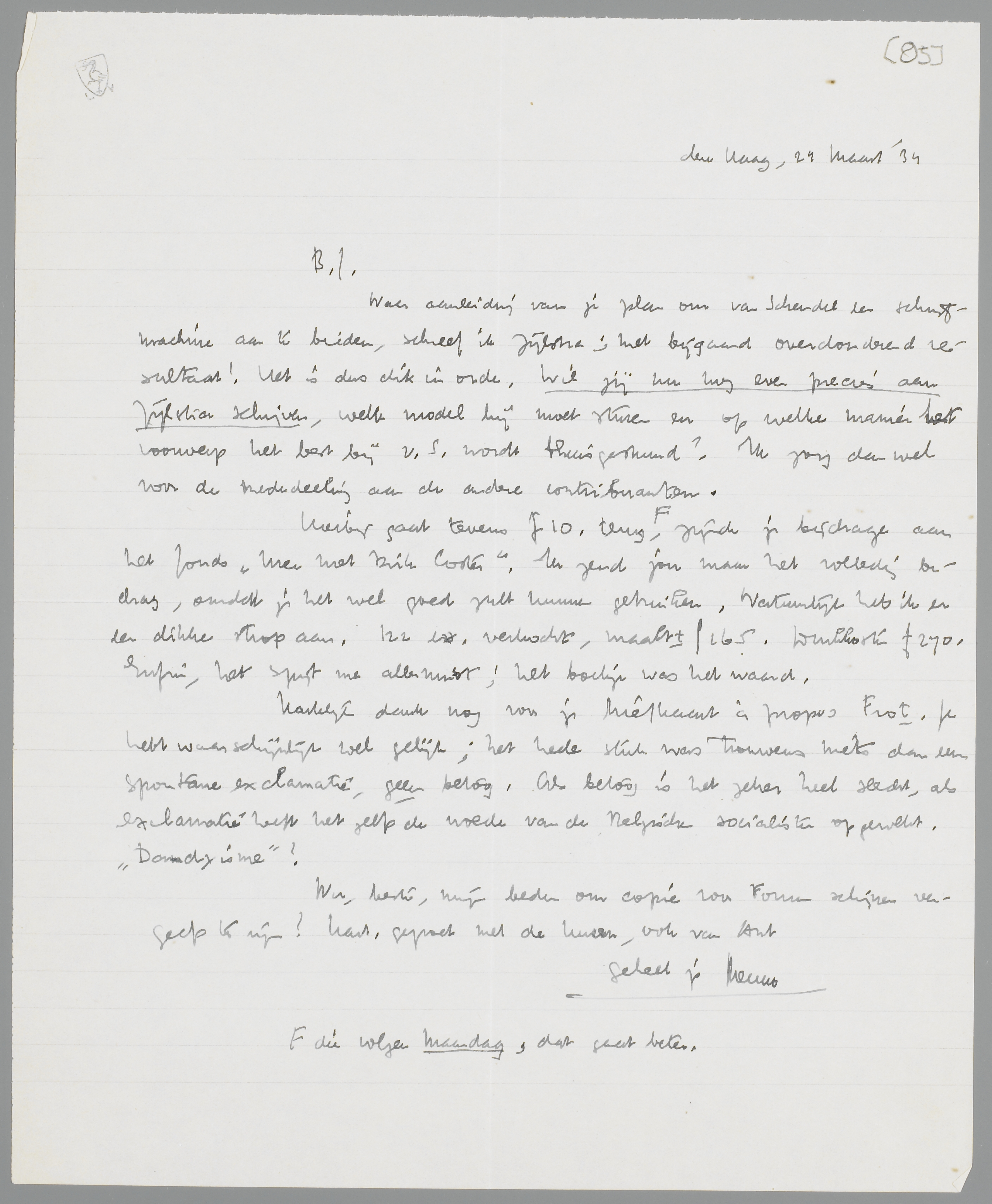 Naar aanleiding van je plan om van Schendel een schrijfmachine aan te bieden, schreef ik Zijlstra; met bijgaand overdonderend resultaat! Het is dus dik in orde. Wil jij nu nog even precies aan Zijlstra schrijven, welk model hij moet sturen en op welke manier het voorwerp het best bij v.S. wordt thuisgestuurd? Ik zorg dan wel voor de mededeeling aan de andere contribuanten.