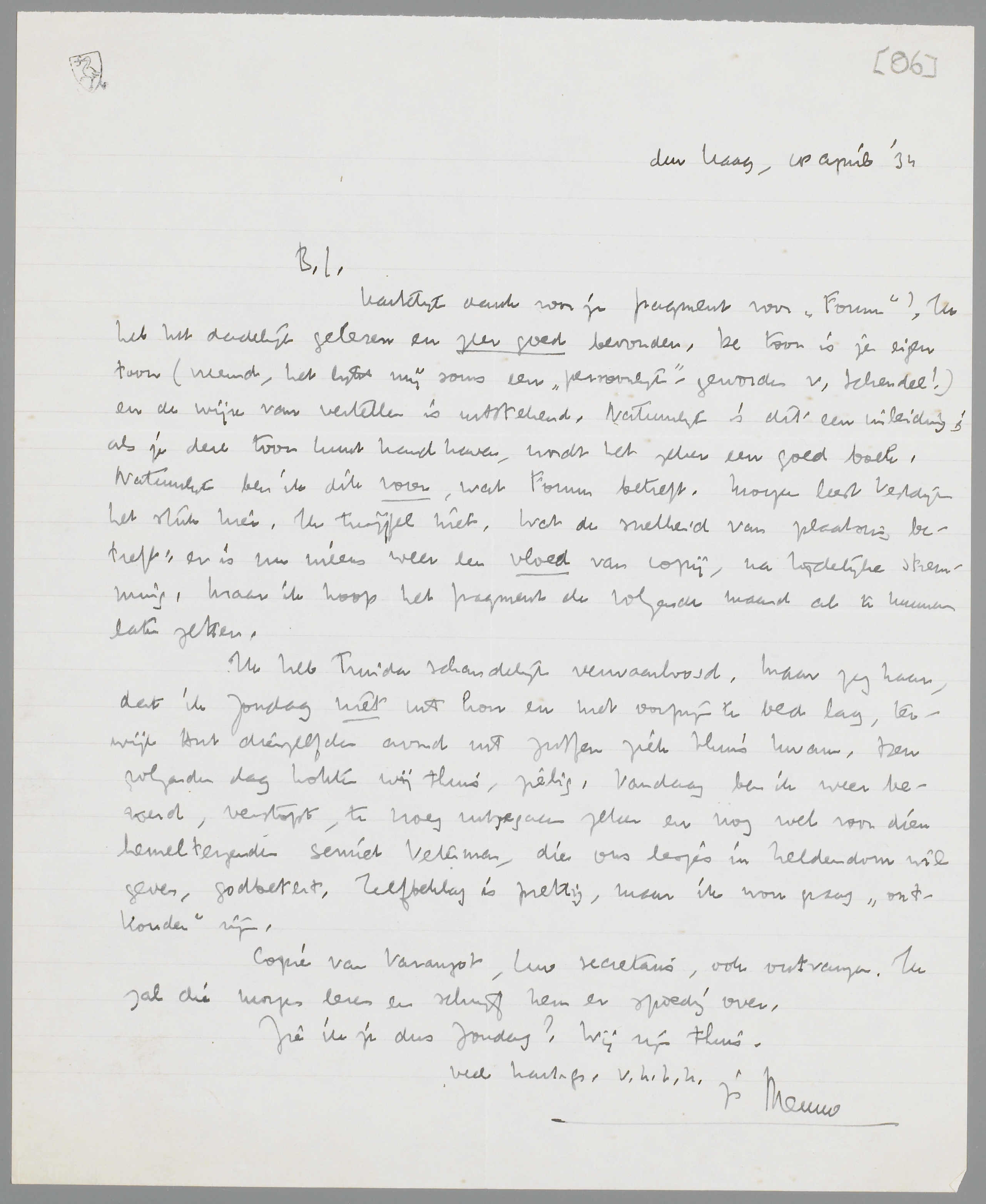 Hartelijk dank voor je fragment voor ‘Forum’! Ik heb het dadelijk gelezen en zeer goed bevonden. De toon is je eigen toon (vreemd, het lijkt mij soms een ‘persoonlijk’-geworden v. Schendel!) en de wijze van vertellen is uitstekend. Natuurlijk is dit een inleiding; als je deze toon kunt handhaven, wordt het zeker een goed boek. Natuurlijk ben ik voor, wat Forum betreft. Morgen leest Vestdijk het stuk hier. Ik twijfel niet, wat de snelheid van plaatsing betreft: er is nu ineens weer een vloed van copij, na tijdelijke stremming. Maar ik hoop het fragment de volgende maand al te kunnen laten zetten.