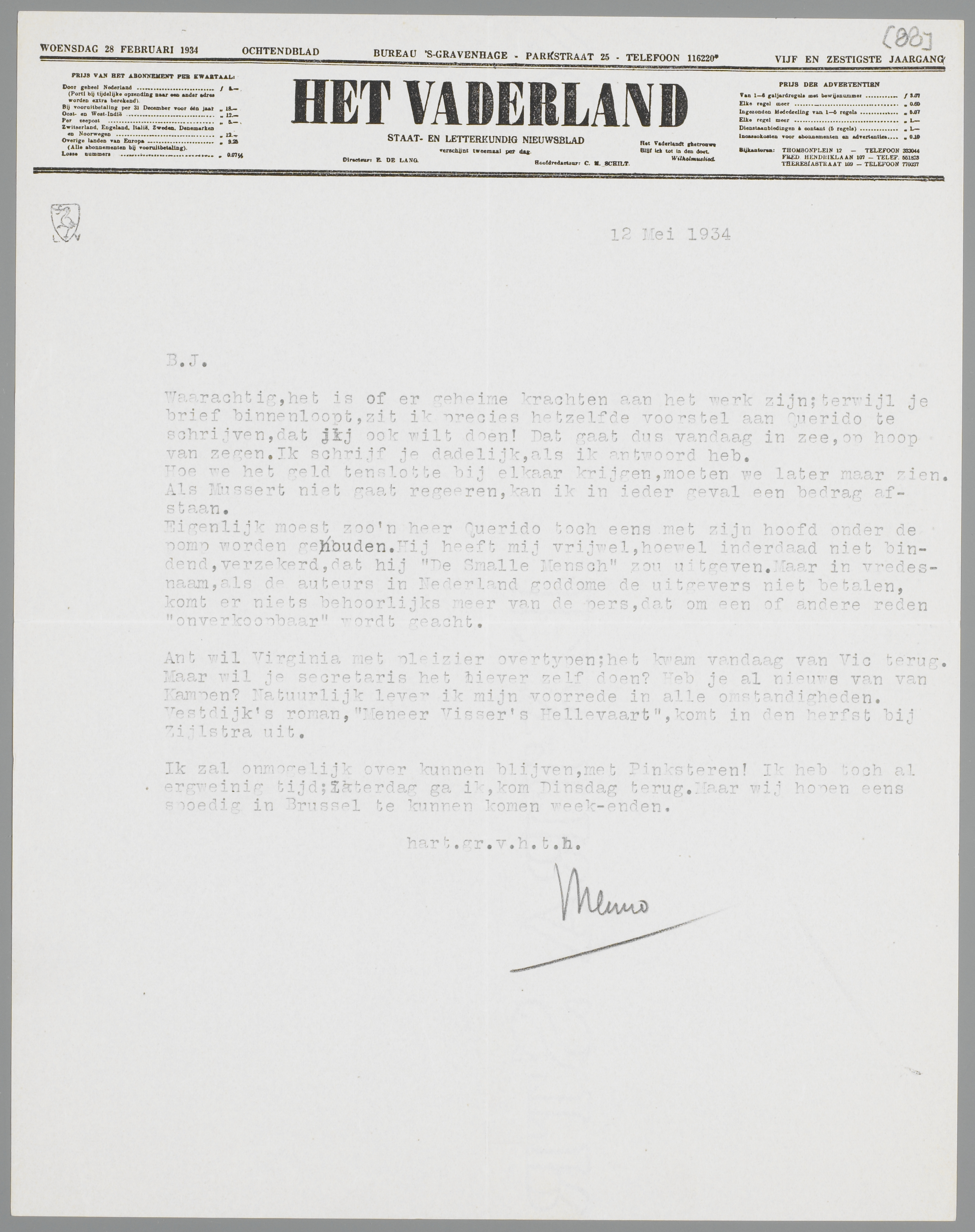 Ant wil Virginia met pleizier overtypen; het kwam vandaag van Vic terug. Maar wil je secretaris het liever zelf doen? Heb je al nieuws van van Kampen? Natuurlijk lever ik mijn voorrede in alle omstandigheden. Vestdijk's roman, ‘Meneer Visser's Hellevaart’, komt in den herfst bij Zijlstra uit.