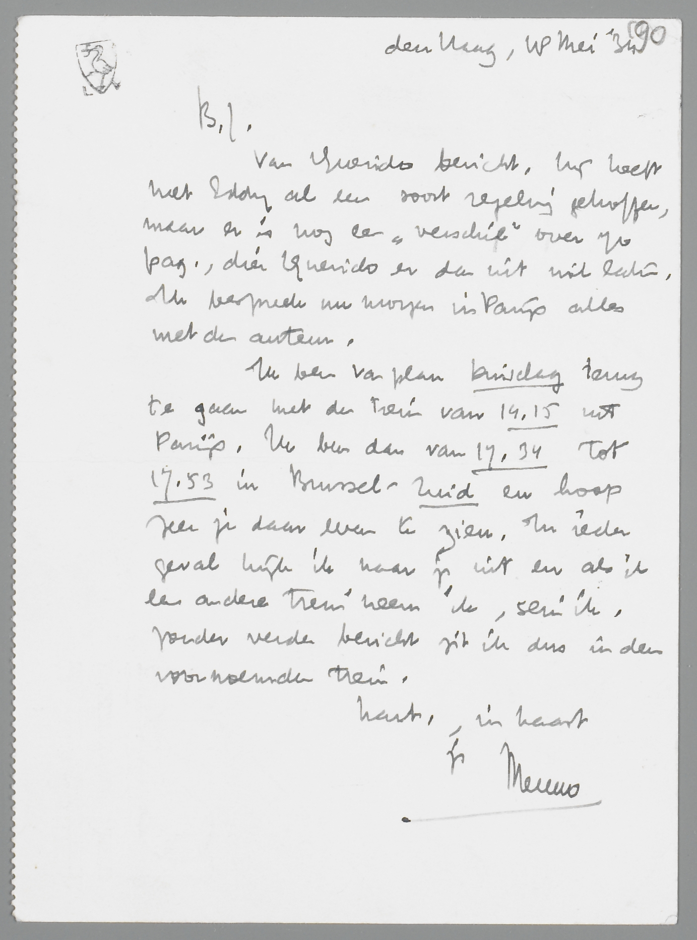 Ik ben van plan Dinsdag terug te gaan met den trein van 14.15 uit Parijs. Ik ben dan van 17.34 tot 17.53 in Brussel-Zuid en hoop zeer je daar even te zien. In ieder geval kijk ik naar je uit en als ik een andere trein neem ik, sein ik. Zonder verder bericht zit ik dus in den voornoemden trein.