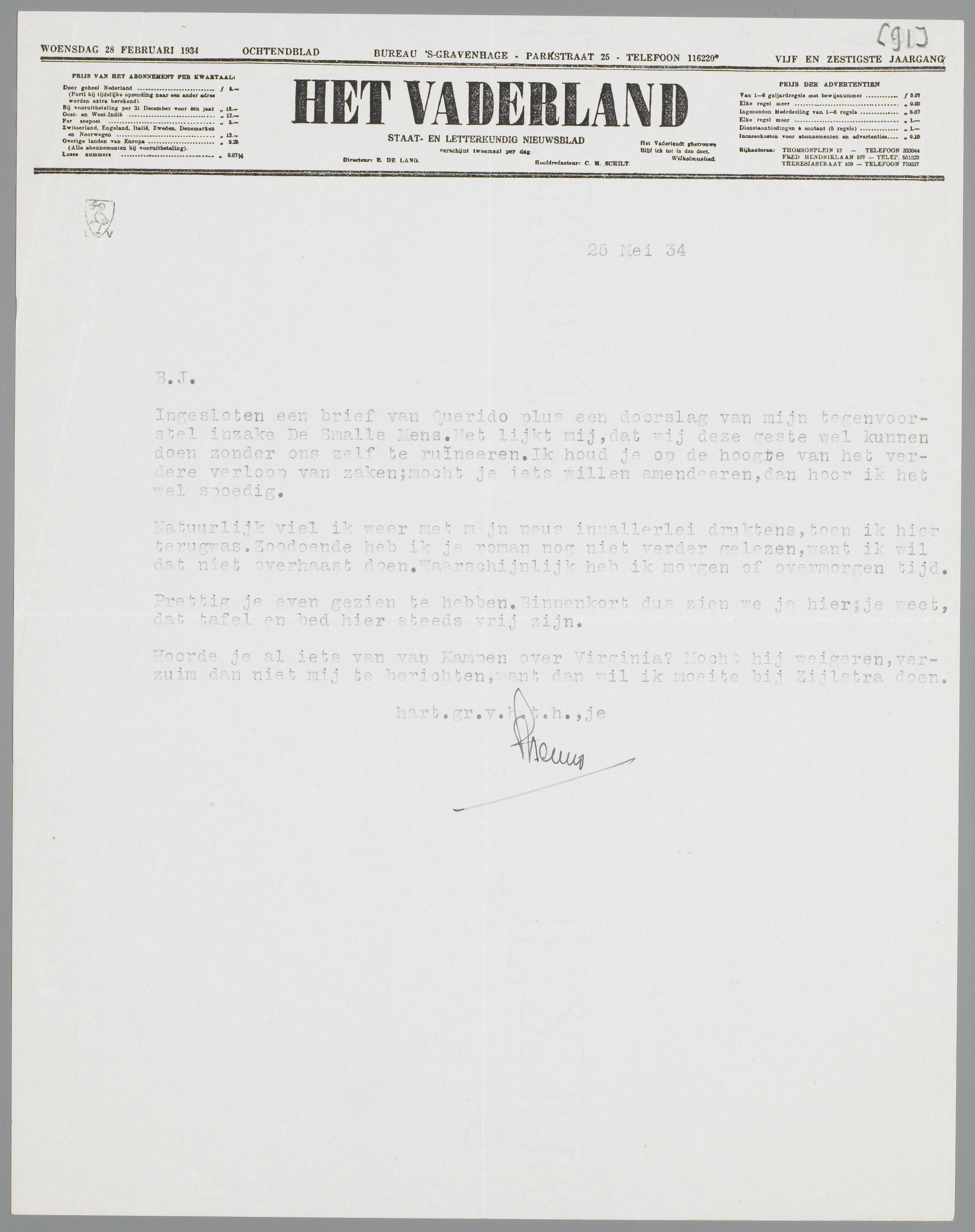Ingesloten een brief van Querido plus een doorslag van mijn tegenvoorstel inzake De Smalle Mens. Het lijkt mij, dat wij deze geste wel kunnen doen zonder ons zelf te ruïneeren. Ik houd je op de hoogte van het verdere verloop van zaken; mocht je iets willen amendeeren, dan hoor ik het wel spoedig.