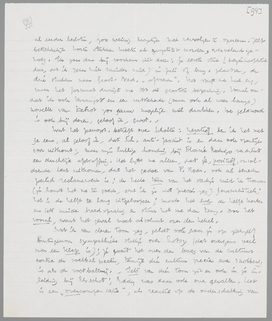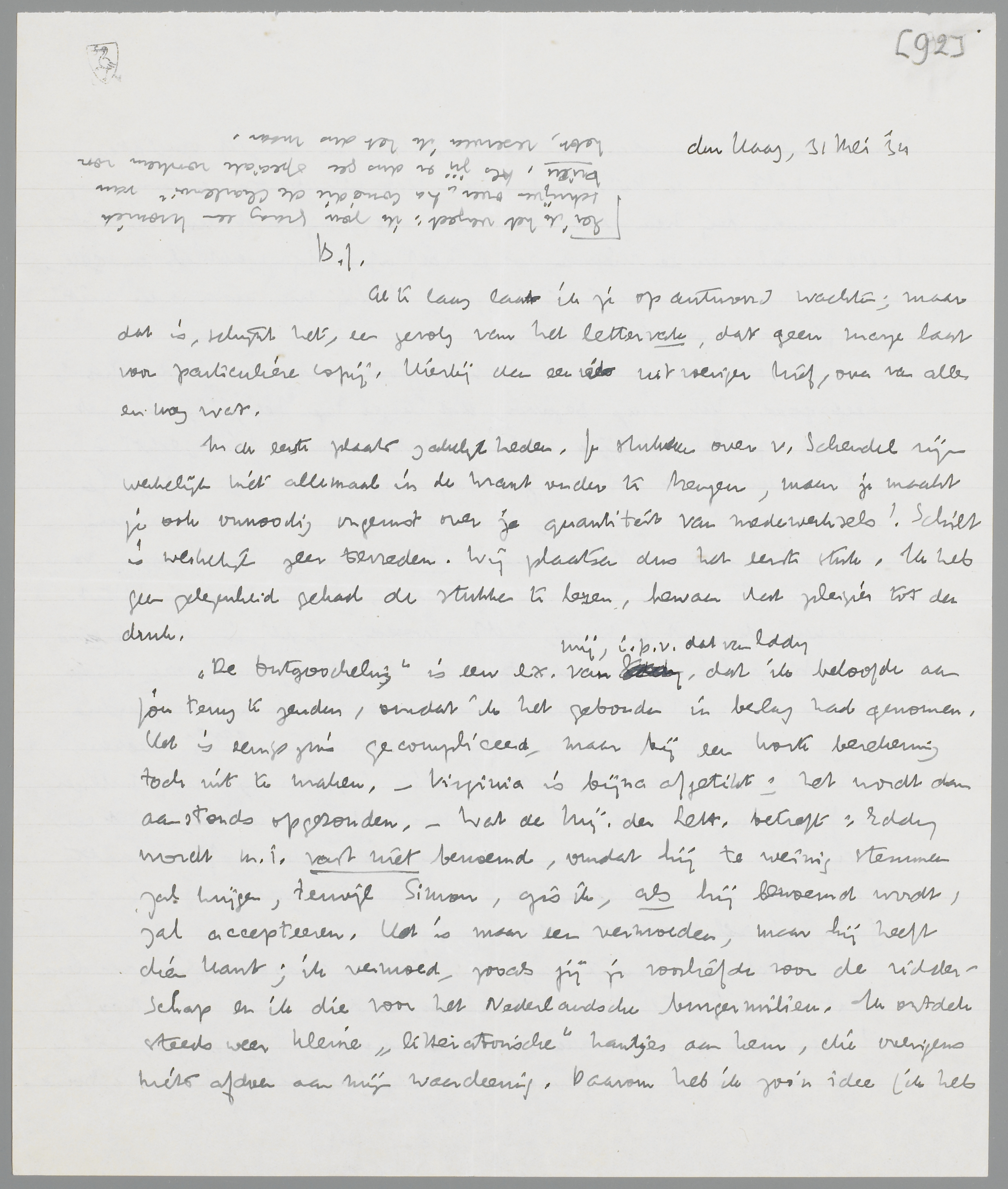‘De Ontgoocheling’ is een ex. van mij, i.p.v. dat van Eddy, dat ik beloofde aan jou terug te zenden, omdat ik het gebonden in beslag had genomen. Het is eenigszins gecompliceerd, maar bij een korte berekening toch uit te maken. - Virginia is bijna afgetikt; het wordt dan aanstonds opgezonden. - Wat de Mij. der Lett. betreft: Eddy wordt m.i. vast niet benoemd, omdat hij te weinig stemmen zal krijgen, terwijl Simon, gis ik, als hij benoemd wordt, zal accepteeren. Het is maar een vermoeden, maar hij heeft dien kant; ik vermoed, zooals jij je voorliefde voor de ridderschap en ik die voor het Nederlandsche burgermilieu. Ik ontdek steeds weer kleine ‘litteratorische’ kantjes aan hem, die overigens niets afdoen aan mijn waardeering. Daarom heb ik zoo'n idee (ik heb hem er niet over gesproken, wil het initiatief aan hemzelf overlaten), dat hij netjes in de Mij. gaat zitten. Het uitzicht op de 1000 pop telt trouwens bij hem lacy ook sterk mee; hij moet leven van niets, heeft nu al weer een nieuwen roman half af. Hij werkt als een gek, is haast niet naar buiten te krijgen; als hij nu maar weer niet in een opium-depressie sukkelt.