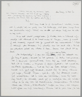 Wat de practijk aangaat: ik kan godsonmogelijk garandeeren, dat de drie stukken er achter elkaar, en dan nog wel voor Nov., in komen. Het is geen werken met die onnoozele 40 pag., wil je van een nummer iets gevarieerds maken; en daarom hebben we trouwens al eerder besloten, zoo weinig mogelijk met vervolgen te opereeren. Zelfs betrekkelijk korte stukken moeten al gesplitst worden, vervelend genoeg. Ik zou dus bij voorkeur dit doen: je eerste stuk (beginhoofdstuk dus, dat ik zeker niet minder vind) in Juli of Aug. plaatsen, de drie hoofdstukken naar Groot- Ned. ‘afvoeren’. Het spijt me heel erg, maar het formaat dwingt me tot de grootste beperking. Vooral omdat ik ook Varangot en een uitstekende (maar ook al weer lange) novelle van Debrot zoo gauw mogelijk wil drukken. De geldnood is ook bij dezen, geloof ik, groot.