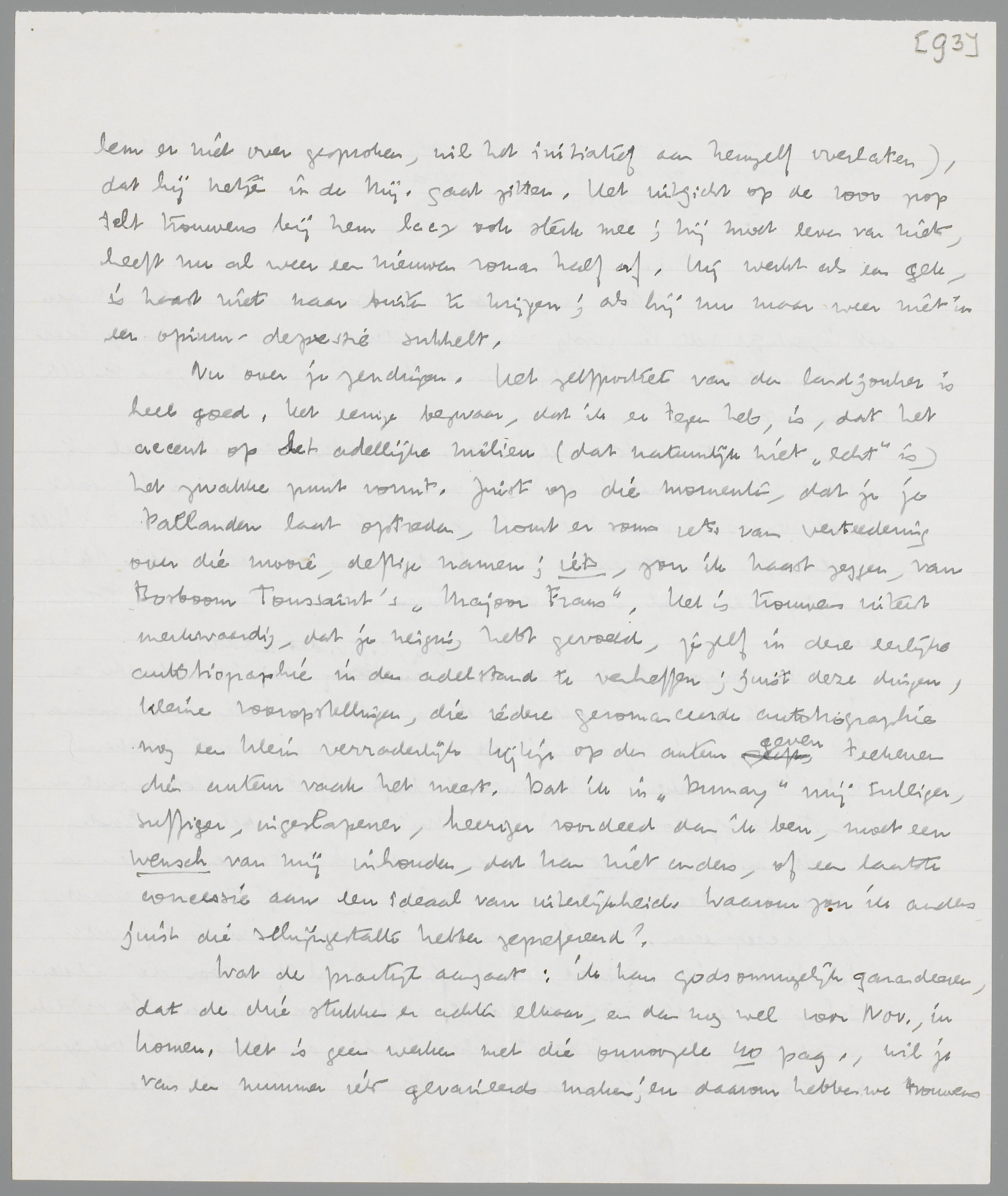Nu over je zendingen. Het zelfportret van den landjonker is heel goed. Het eenige bezwaar, dat ik er tegen heb, is, dat het accent op het adellijke milieu (dat natuurlijk niet ‘echt’ is) het zwakke punt vormt. Juist op die momenten, dat je je Pallanden laat optreden, komt er soms iets van verteedering over die mooie, deftige namen; iets, zou ik haast zeggen, van Bosboom Toussaint's ‘Majoor Frans’. Het is trouwens uiterst merkwaardig, dat je neiging hebt gevoeld, jezelf in deze eerlijke autobiographie in den adelstand te verheffen; juist deze dingen, kleine vooropstellingen, die iedere geromanceerde autobiographie nog een klein verraderlijk kijkje op den auteur geven, teekenen dien auteur vaak het meest. Dat ik in ‘Dumay’ mij sulliger, suffiger, ingeslapener, heeriger voordeed dan ik ben, moet een wensch van mij inhouden, dat kan niet anders, of een laatste concessie aan een ideaal van uiterlijkheid. Waarom zou ik anders juist die schijngestalte hebben geprefereerd?