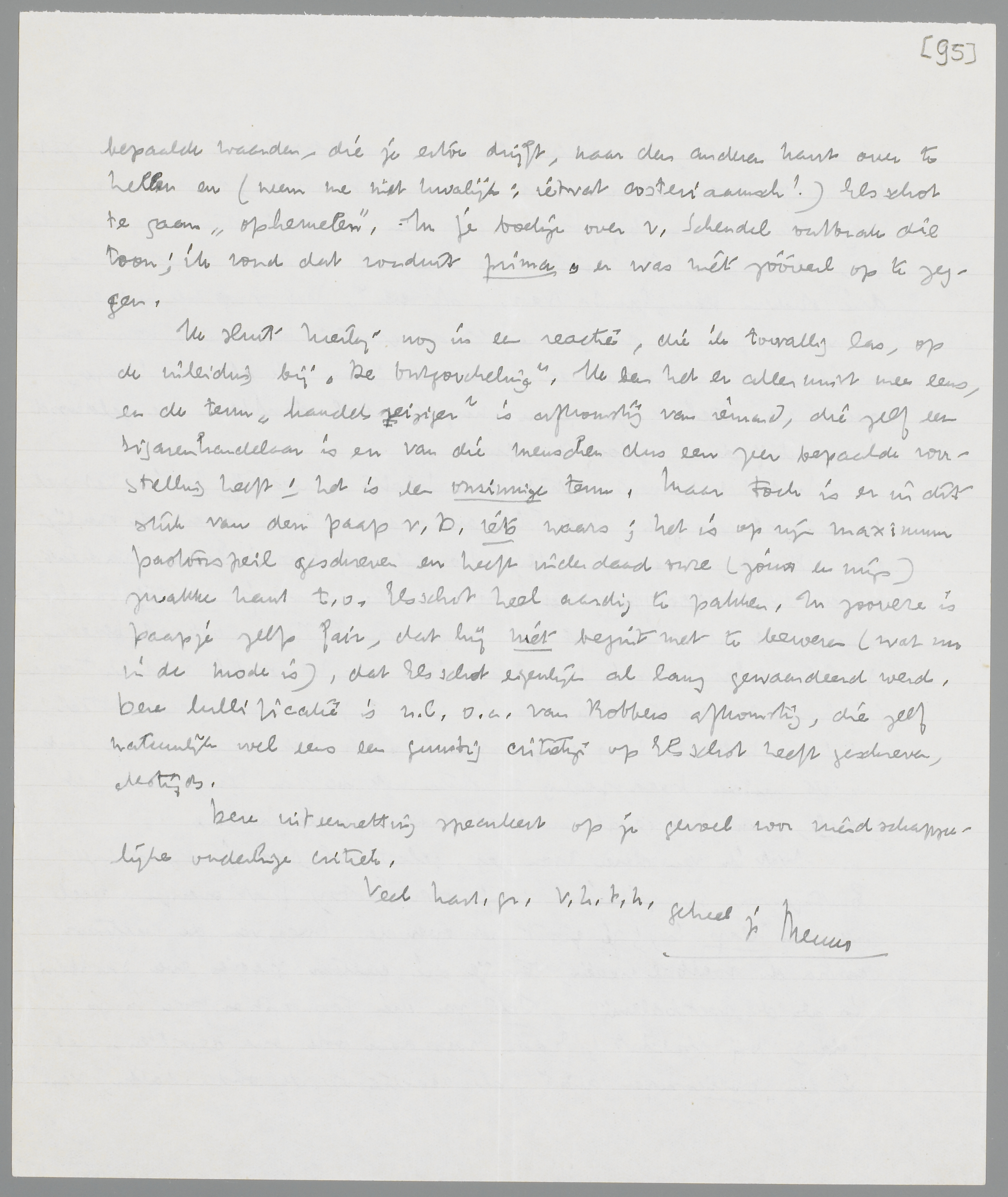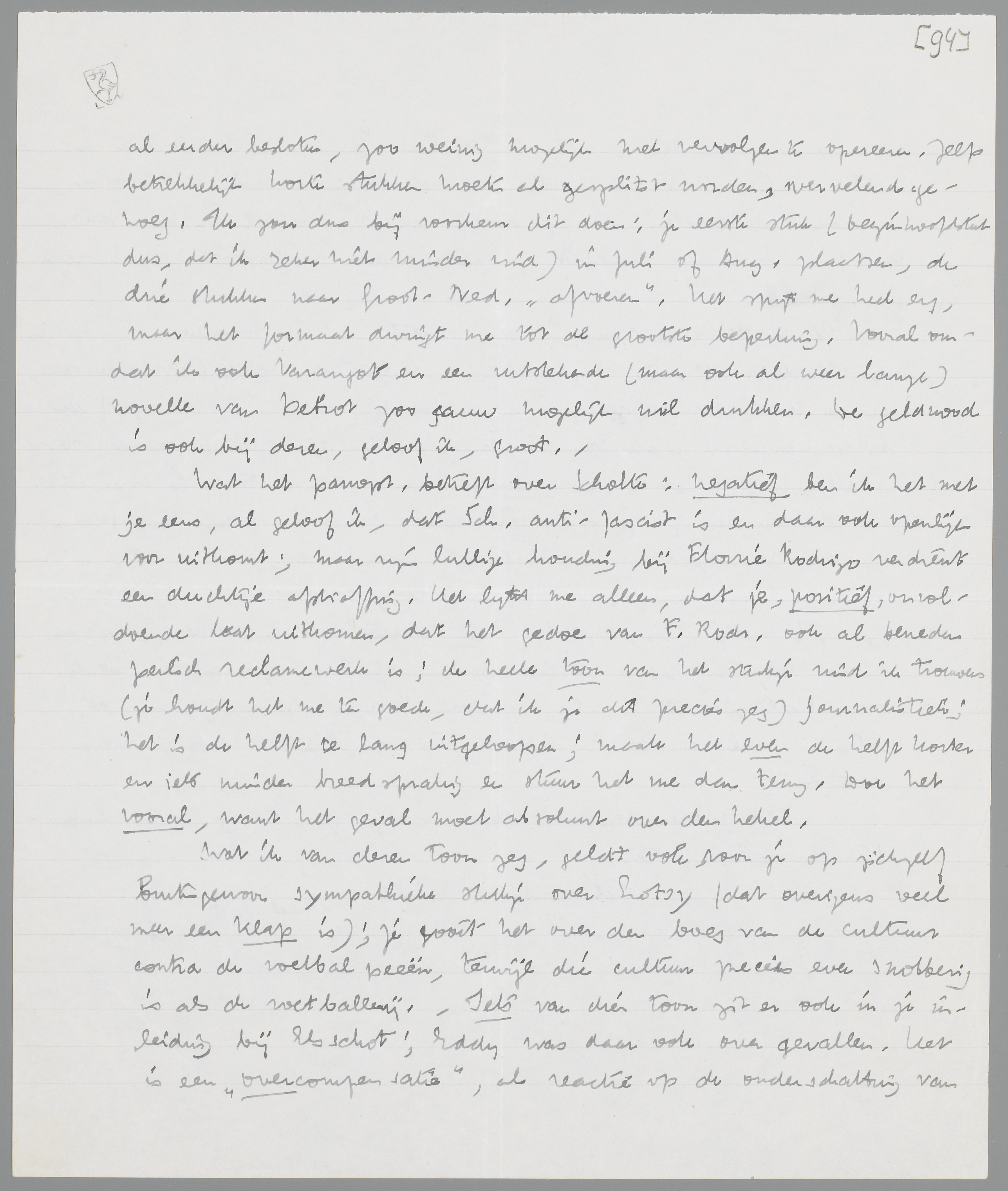 Wat ik van dezen toon zeg, geldt ook, voor je op zichzelf buitengewoon sympathieke stukje over Lotsy (dat overigens veel meer een klap is); je gooit het over den boeg van de cultuur contra de voetbal peeën, terwijl die cultuur precies even snobberig is als de voetballerij. Iets van dien toon zit er ook in je inleiding bij Elsschot; Eddy was daar ook over gevallen. Het is een ‘overcompensatie’, als reactie op de onderschatting van bepaalde waarden, die je ertoe drijft, naar den anderen kant over te hellen en (neem me niet kwalijk: ietwat Costeriaansch!) Elsschot te gaan ‘ophemelen’. In je boekje over v. Schendel ontbrak die toon; ik vond dat ronduit prima, er was niet zóóveel op te zeggen.
