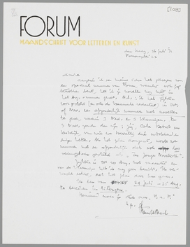 Aangezien ik een nieuw idee heb gekregen voor een speciaal nummer van Forum, waarbij ook jij betrokken bent, heb ik je novelle nog niet in het Aug.-nummer gezet. N.l.: ik heb Zijlstra voorgesteld (en ook de Vlaamsche redacteurs) in Oct. of Nov. een afzonderlijk nummer met novellen te geven, waarin 3 Ned. en 3 Vlamingen. De 3 Ned. zouden dan zijn: Jij, Cola Debrot en Vestdijk, van wie we toevallig drie uitstekende dingen hebben. Als het plan doorgaat, wordt het nummer met een afzonderlijk dek ook los verkrijgbaar gesteld als ‘Zes Jonge Novellisten’.