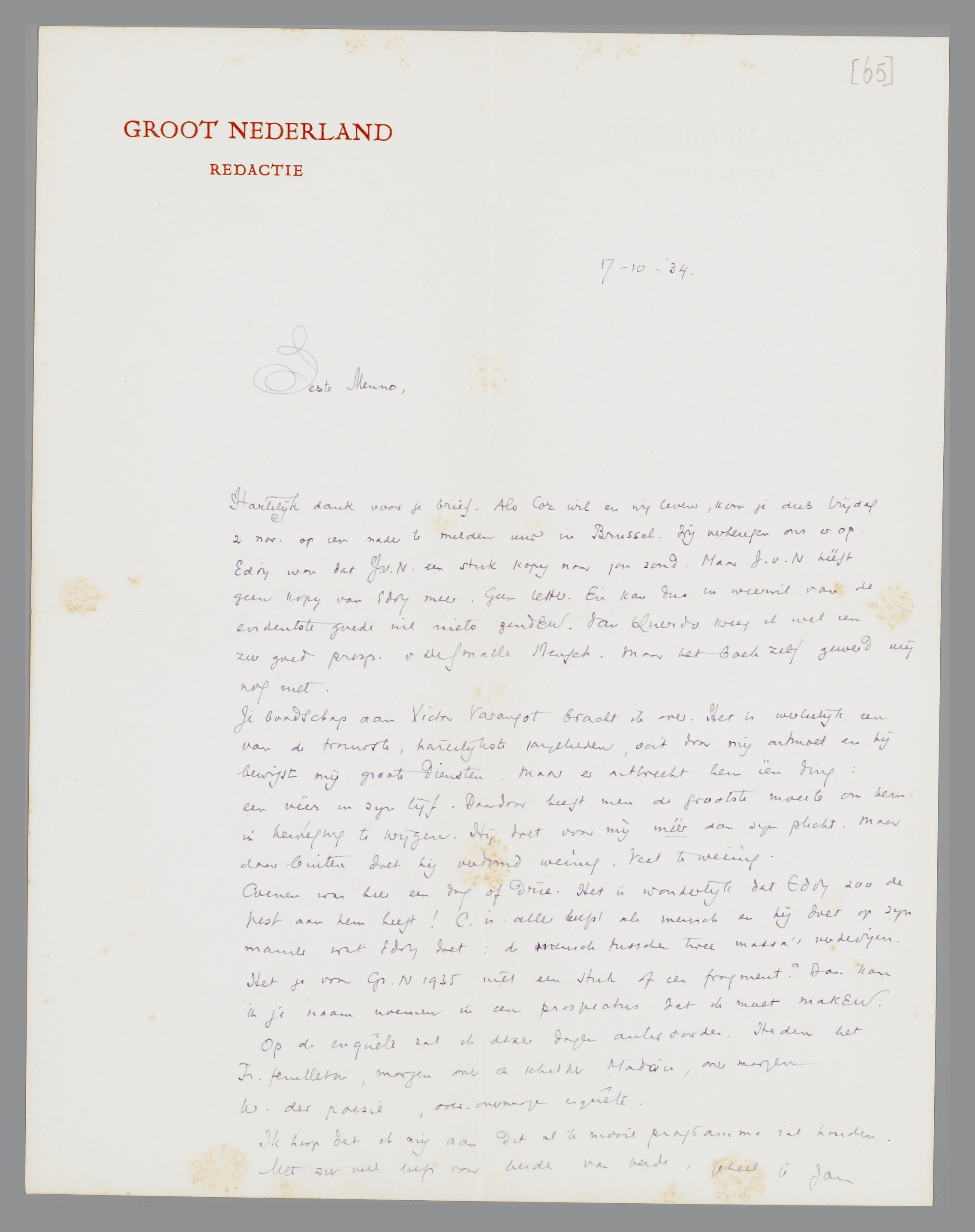 Eddy wou dat J.v.N. een stuk kopij naar jou zond. Maar J.v.N. hééft geen kopij van Eddy meer. Geen letter. En kan dus in weerwil van de evidentste goede wil niets zenden. Van Querido kreeg ik wel een zeer goed prosp. v. De Smalle Mensch. Maar het boek zelf gewerd mij nog niet.