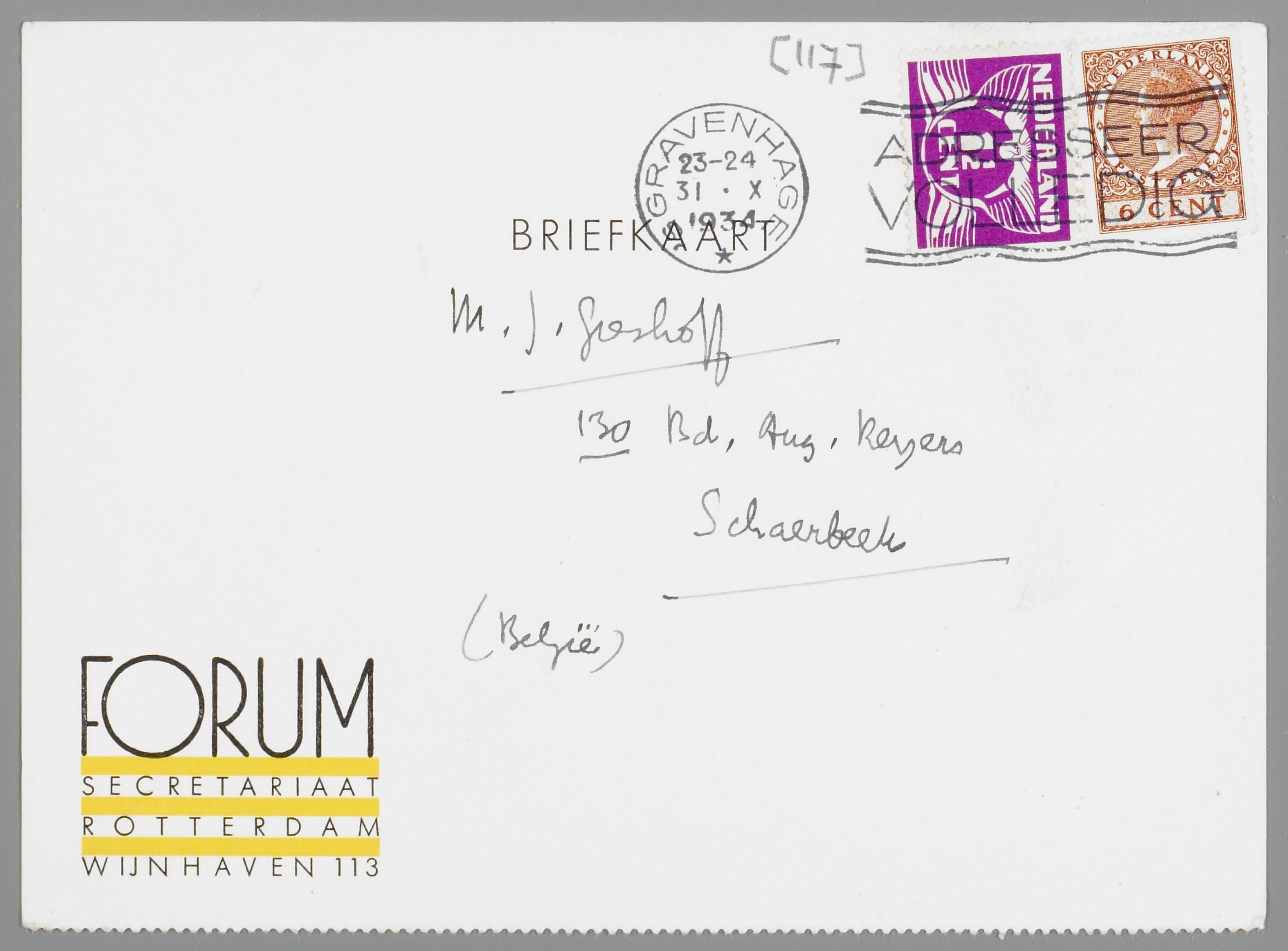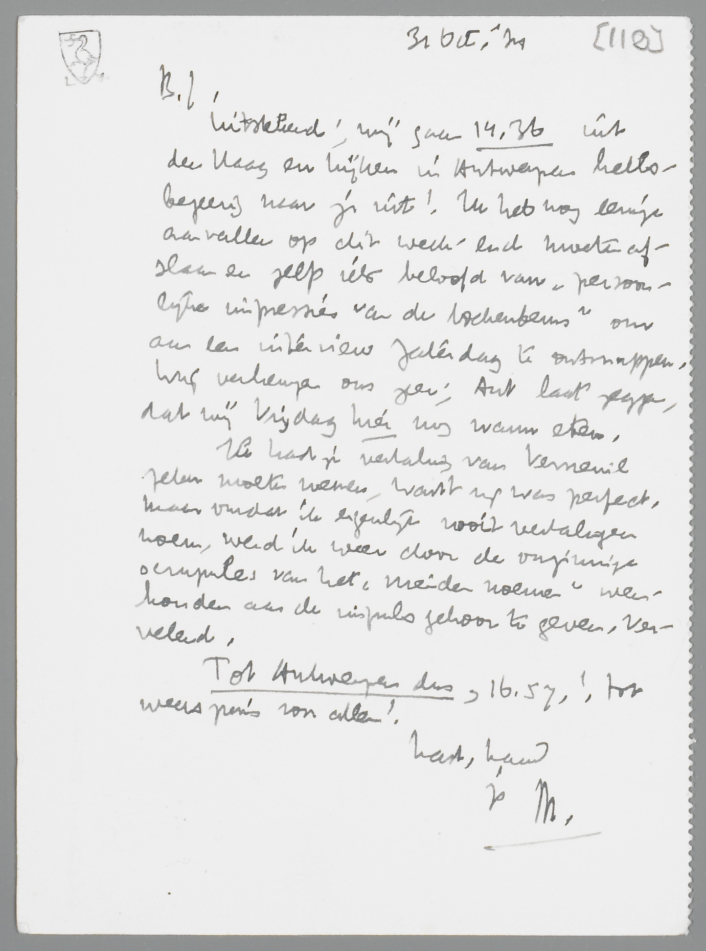 Uitstekend; wij gaan 14.36 uit den Haag en kijken in Antwerpen heilsbegeerig naar je uit! Ik heb nog eenige aanvallen op dit week-end moeten afslaan en zelfs iets beloofd van ‘persoonlijke impressies van de boekenbeurs’ om aan een interview Zaterdag te ontsnappen. Wij verheugen ons zeer; Ant laat zeggen, dat wij Vrijdag hier nog warm eten.