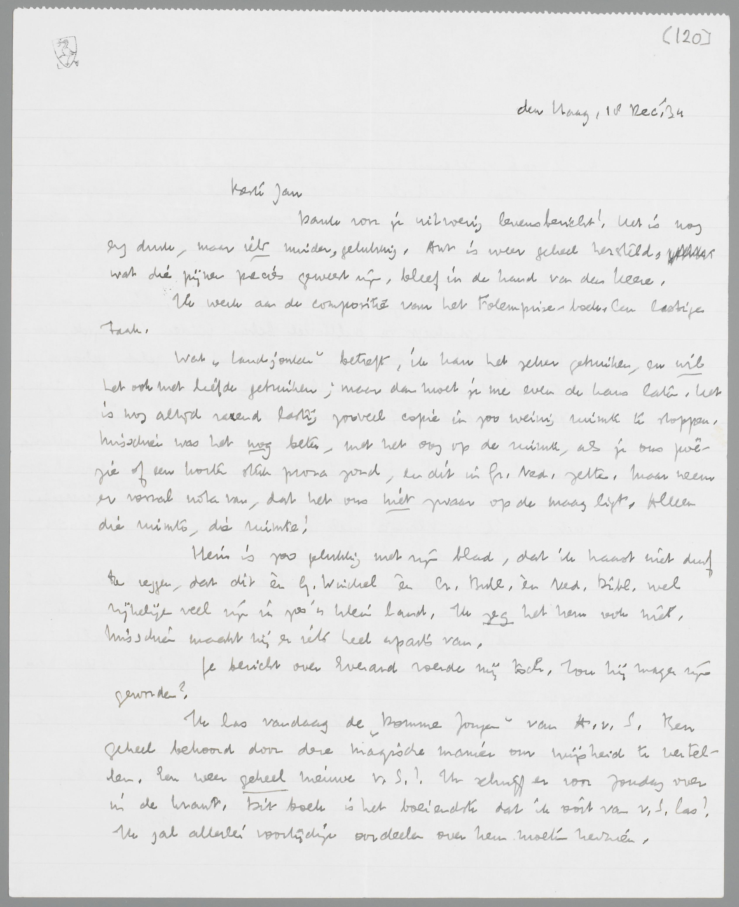 Wat ‘landjonker’ betreft, ik kan het zeker gebruiken, en wil het ook met liefde gebruiken, maar dan moet je me even de kans laten. Het is nog altijd razend lastig zooveel copie in zoo weinig ruimte te stoppen. Misschien was het nog beter, met het oog op de ruimte, als je ons poëzie of een korter stuk proza zond, en dit in Gr. Ned. zette. Maar neem er vooral nota van, dat het ons niet zwaar op de maag ligt. Alleen die ruimte, die ruimte!
