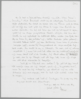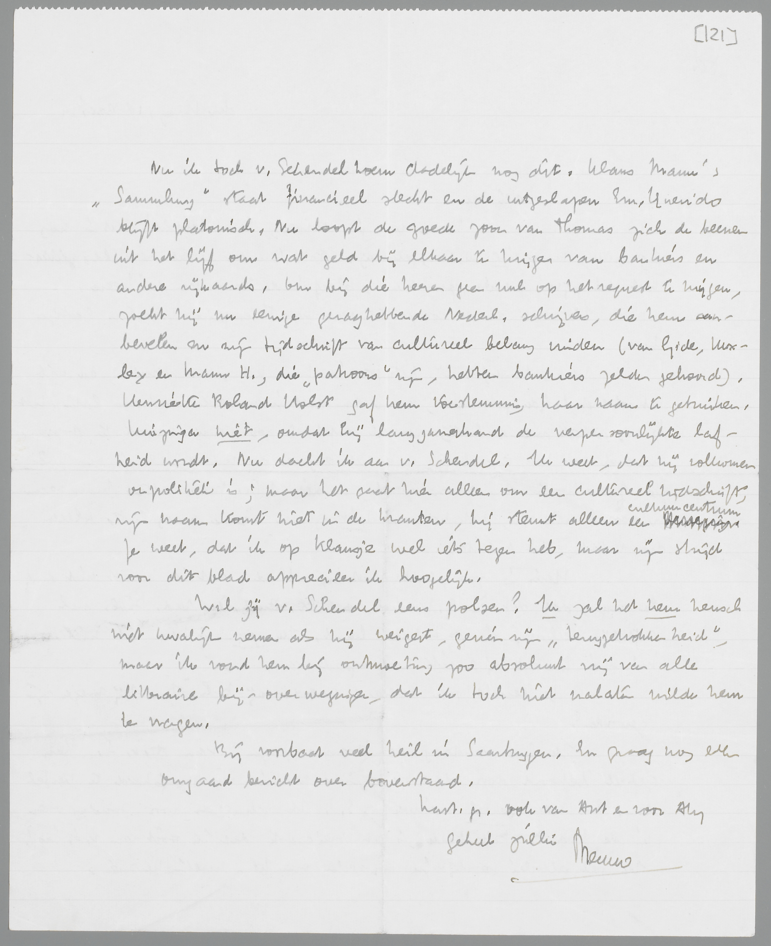 Nu ik toch v. Schendel noem dadelijk nog dit. Klaus Mann's ‘Sammlung’ staat financieel slecht en de uitgeslapen Em. Querido blijft platonisch. Nu loopt de goede zoon van Thomas zich de beenen uit het lijf om wat geld bij elkaar te krijgen van bankiers en andere rijkaards. Om bij die heeren geen nul op het request te krijgen, zoekt hij eenige gezaghebbende Nederl. schrijvers, die hem aanbevelen en zijn tijdschrift van cultureel belang vinden (van Gide, Huxley en Mann H., die ‘patroons’ zijn, hebben bankiers zelden gehoord). Henriette Roland Holst gaf hem toestemming haar naam te gebruiken, Huizinga niet, omdat hij langzamerhand de verpersoonlijkte lafheid wordt. Nu dacht ik aan v. Schendel. Ik weet, dat hij volkomen onpolitiek is; maar het gaat hier alleen om een cultureel tijdschrift, zijn naam komt niet in de kranten, hij steunt alleen een cultuurcentrum. Je weet, dat ik op Klausje wel iets tegen heb, maar zijn strijd voor dit blad apprecieer ik hoogelijk.