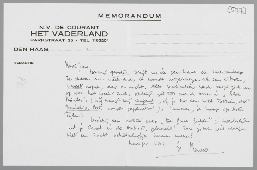 Tot mijn grooten spijt zie ik geen kans de vriendschap te dienen a.s. week-end, ik word uitgeknepen als een citroen, zweet copie, dag en nacht. Alle particuliere werk hoopt zich nu op voor het week-end. Vestdijk zit tot over de ooren in ‘Else Böhler’. (hij vraagt mij dringend, of je nog eens wilt toezien, dat Barioli en Peter wordt geplaatst!). Jammer, ik hoop op beter tijden!