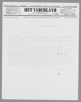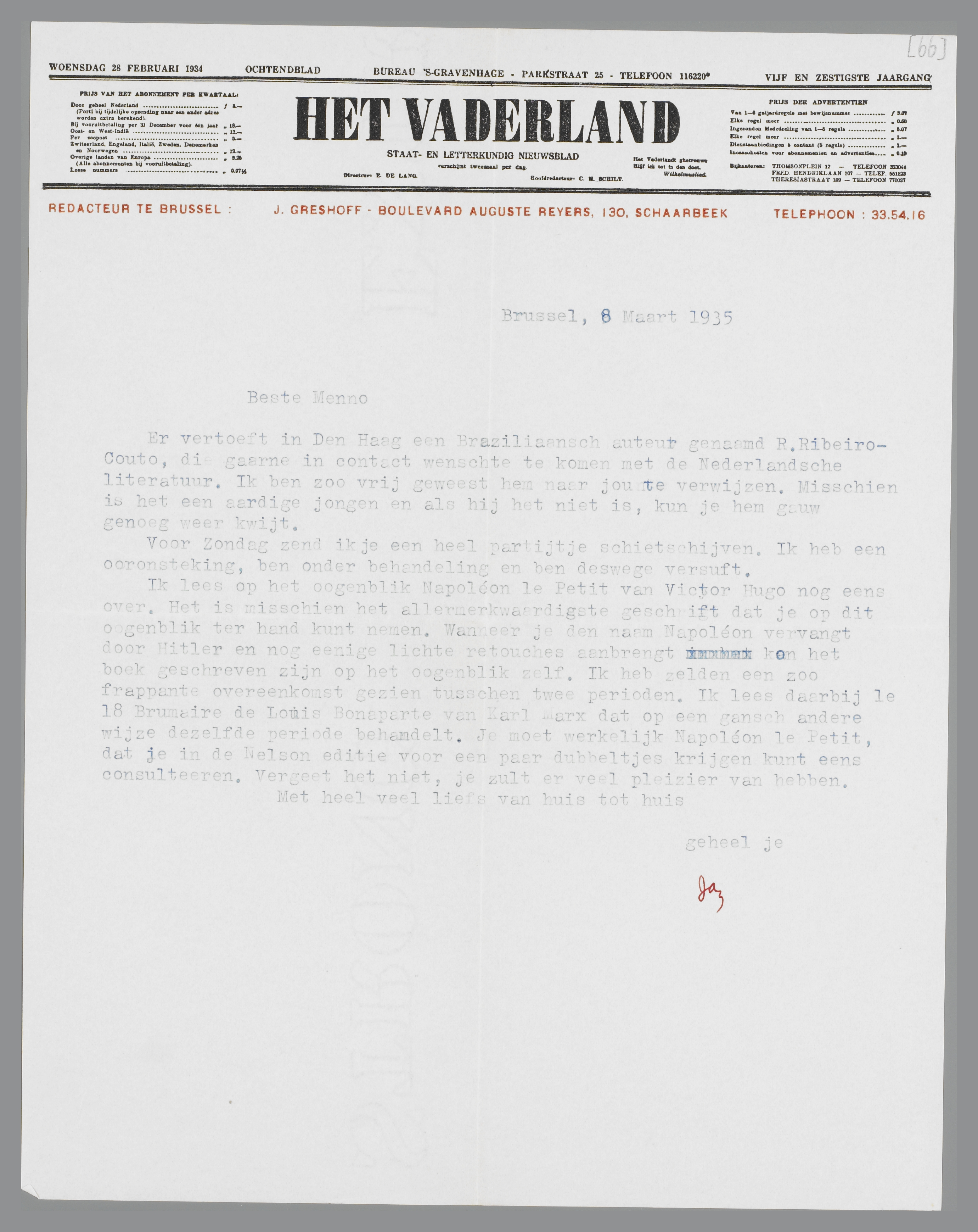 Ik lees op het oogenblik Napoléon le Petit van Victor Hugo nog eens over. Het is misschien het allermerkwaardigste geschrift dat je op dit oogenblik ter hand kunt nemen. Wanneer je den naam Napoléon vervangt door Hitler en nog eenige lichte retouches aanbrengt kon het boek geschreven zijn op het oogenblik zelf. Ik heb zelden een zoo frappante overeenkomst gezien tusschen twee perioden. Ik lees daarbij le 18 Brumaire de Louis Bonaparte van Karl Marx dat op een gansch andere wijze dezelfde periode behandelt. Je moet werkelijk Naopléon le Petit, dat je in de Nelson editie voor een paar dubbeltjes krijgen kunt eens consulteeren. Vergeet het niet, je zult er veel pleizier van hebben.
