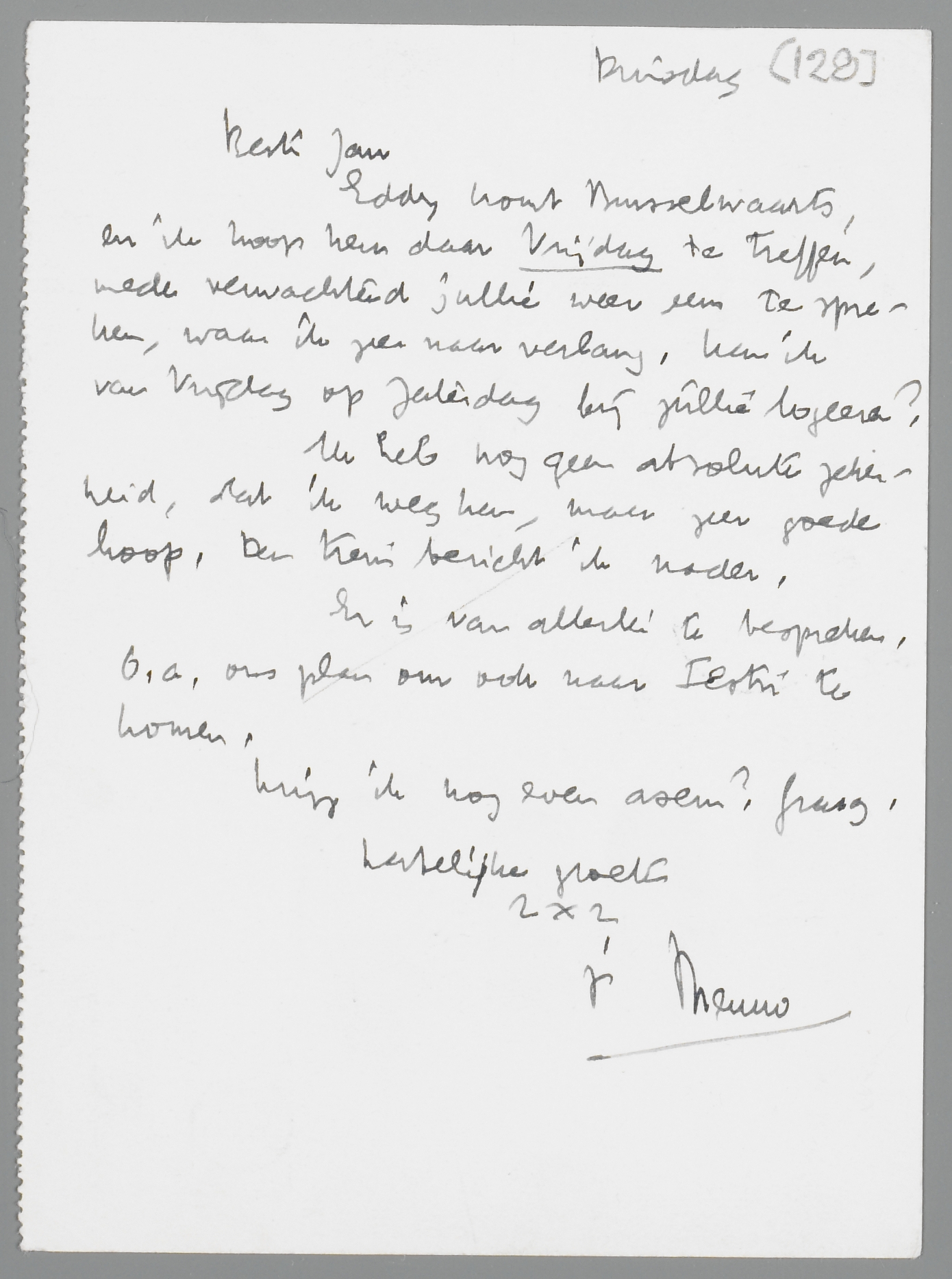 Eddy komt Brusselwaarts, en ik hoop hem daar Vrijdag te treffen, mede verwachtend jullie weer eens te spreken, waar ik zeer naar verlang. Kan ik van Vrijdag op Zaterdag bij jullie logeeren?