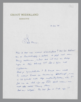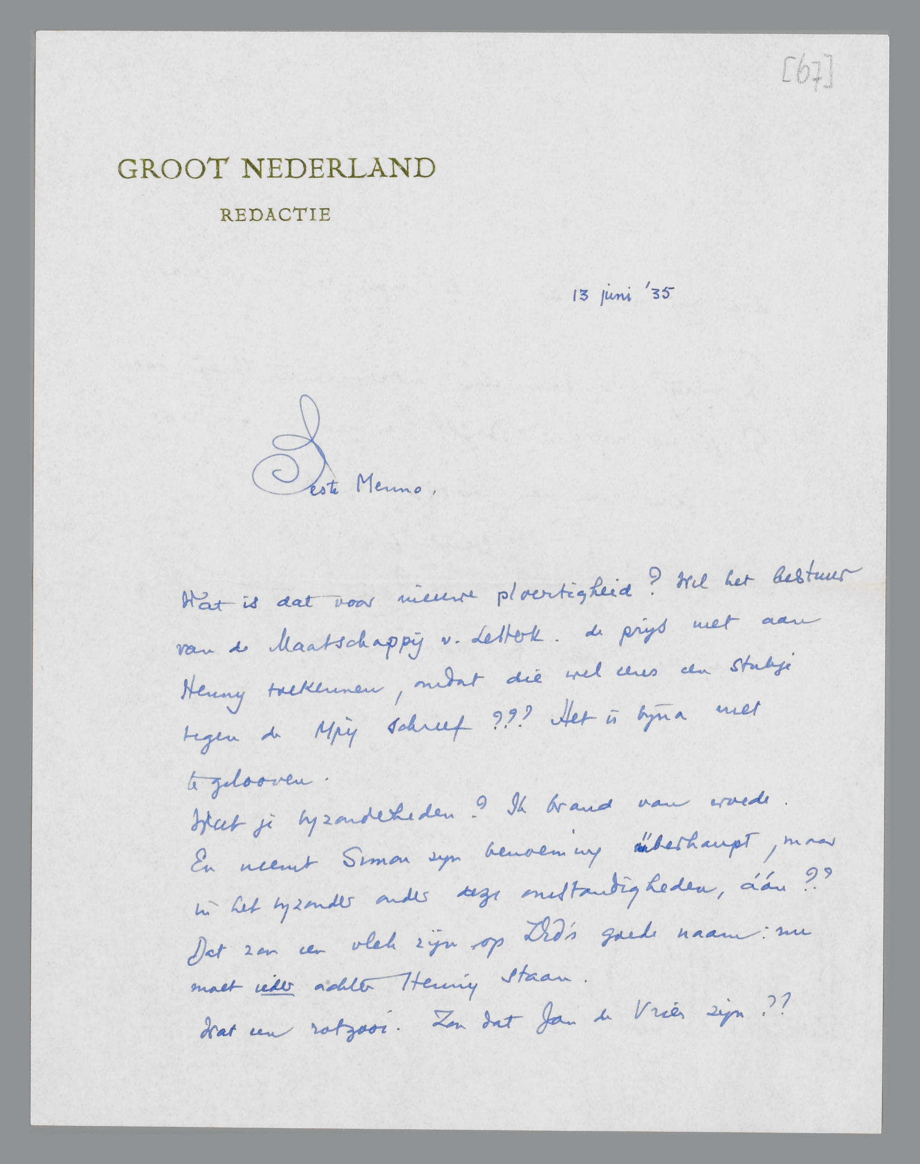 Wat is dat voor miezerige ploertigheid? Wil het bestuur van de Maatschappij v. Letterk. De prijs niet aan Henny toekennen, omdat die wel eens een stukje tegen de Mpij schreef??? Het is bijna niet te gelooven.