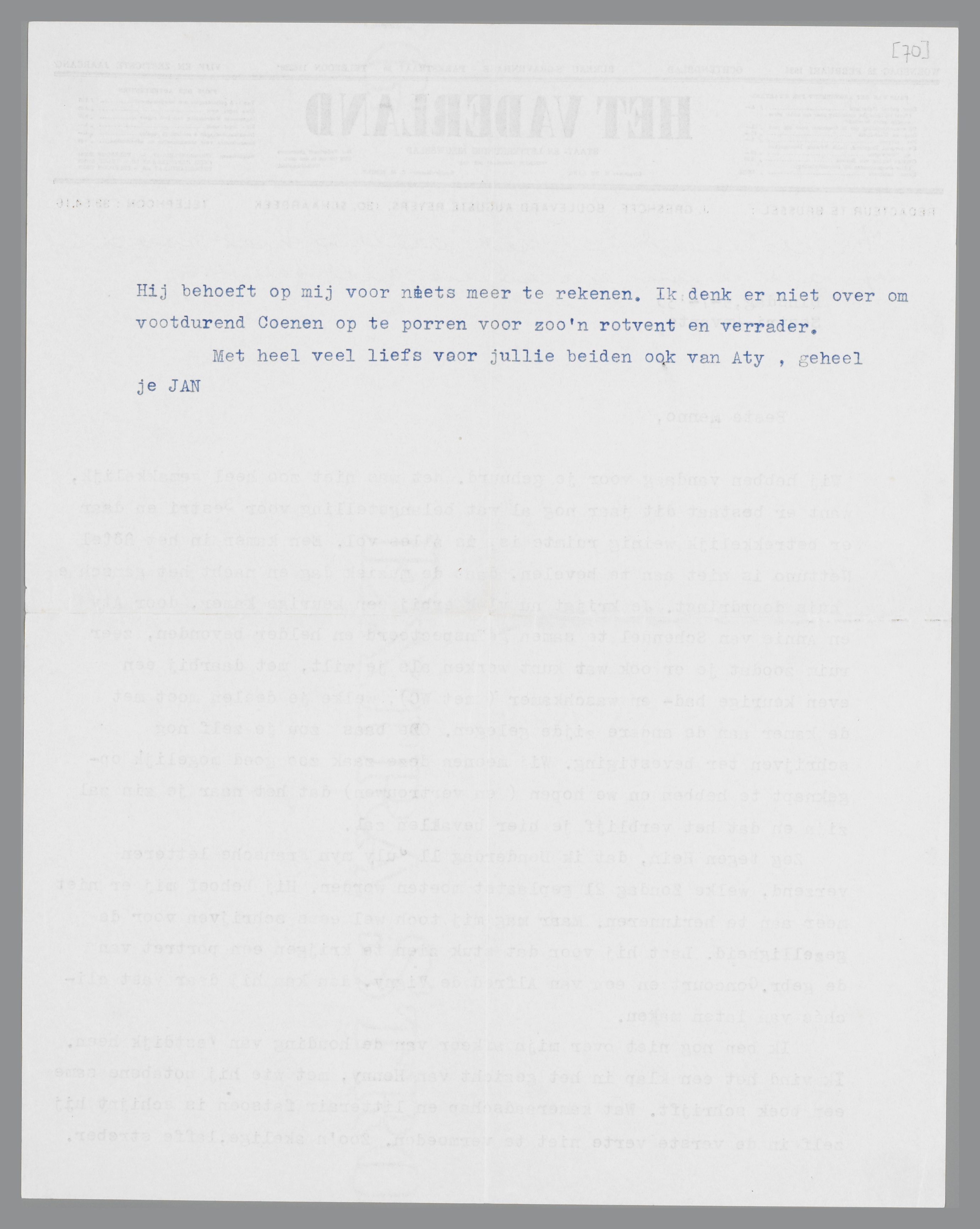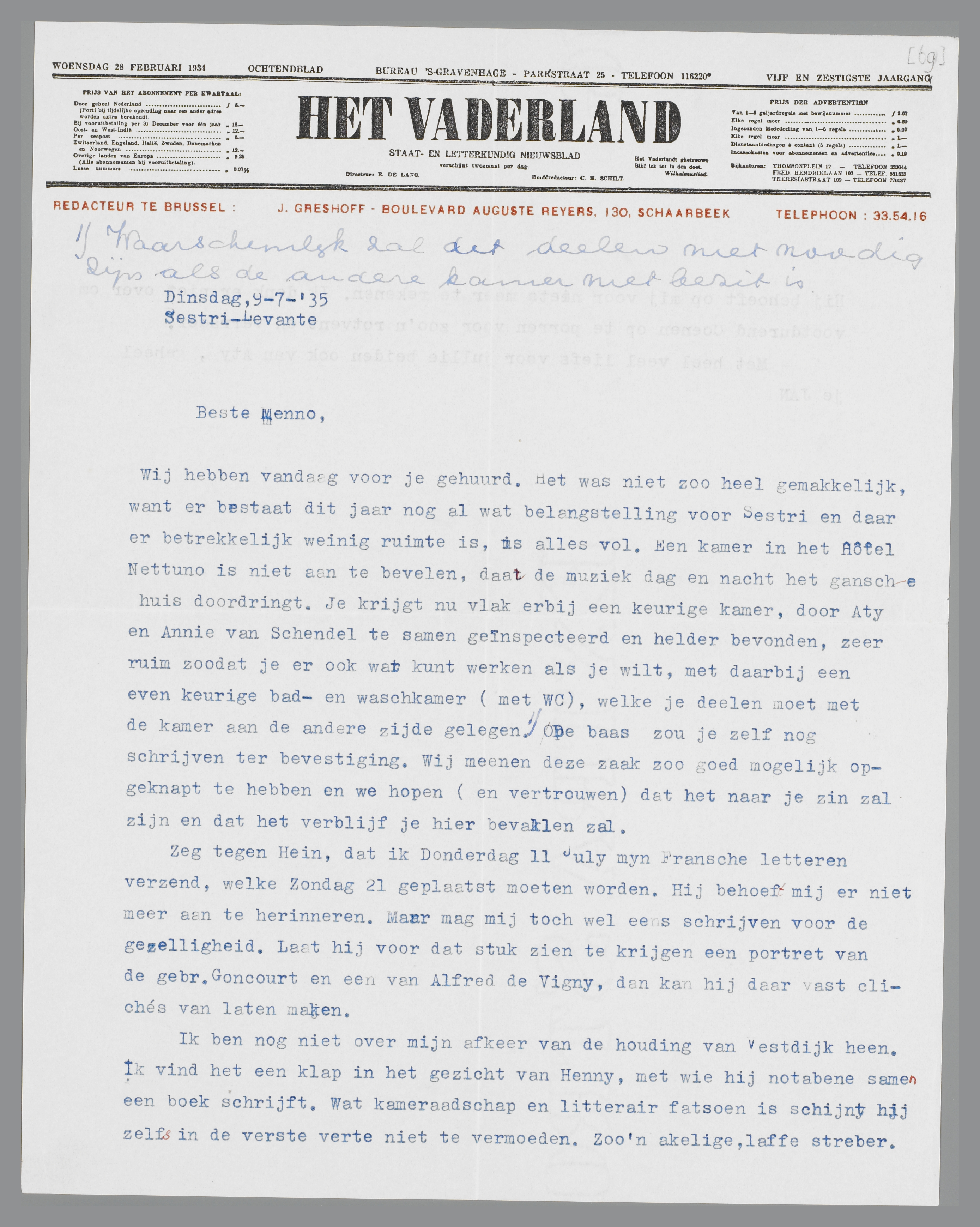Wij hebben vandaag voor je gehuurd. Het was niet zoo heel gemakkelijk, want er bestaat dit jaar nogal wat belangstelling voor Sestri en daar er betrekkelijk weinig ruimte is, is alles vol. Een kamer in Hôtel Nettuno is niet aan te bevelen, daar de muziek dag en nacht het gansche huis doordringt. Je krijgt nu vlak erbij een keurige kamer, door Aty en Annie van Schendel te samen geïnspecteerd en helder bevonden, zeer ruim zoodat je er ook wat kunt werken als je wilt, met daarbij een even keurige bad- en waschkamer (met WC), welke je deelen moet met de kamer aan de andere zijde gelegen.1 De baas zou je zelf nog schrijven ter bevestiging. Wij meenen deze zaak zoo goed mogelijk opgeknapt te hebben en wij hopen (en vertrouwen) dat het naar je zin zal zijn en dat het verblijf je hier bevallen zal.