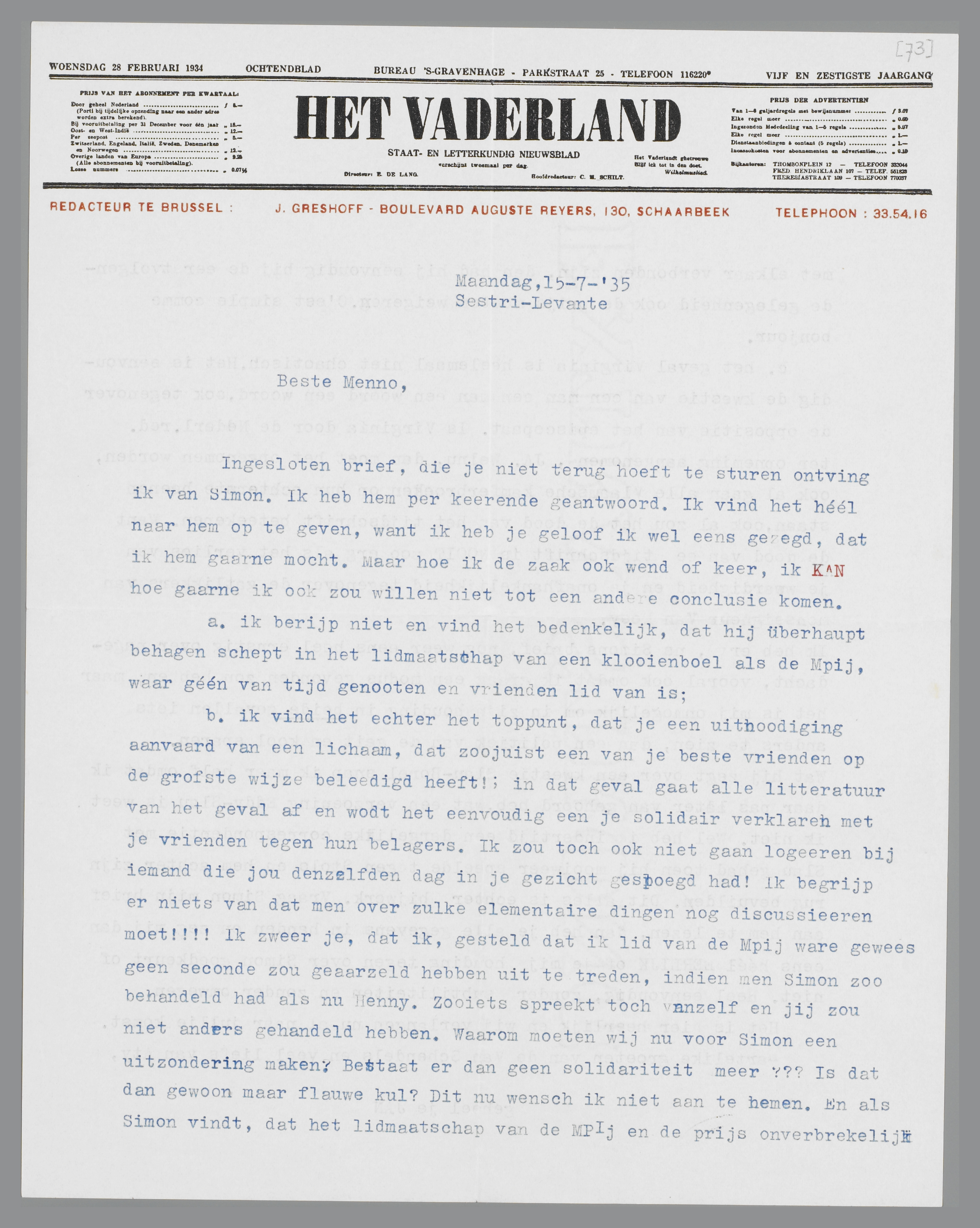 b. ik vind het echter het toppunt, dat je een uitnoodiging aanvaard van een lichaam, dat zoojuist een van je beste vrienden op de grofste wijze beleedigd heeft!; in dat geval gaat alle litteratuur van het geval af en wordt het eenvoudig een je solidair verklaren met je vrienden tegen hun belagers. Ik zou toch ook niet gaan logeeren bij iemand die jou denzelfden dag in je gezicht gespoegd had! Ik begrijp er niets van dat men over zulke elementaire dingen nog discussieeren moet!!!! Ik zweer je, dat ik, gesteld dat ik lid van de Mpij ware geweest geen seconde zou geaarzeld hebben uit te treden, indien men Simon zoo behandeld had als nu Henny. Zooiets spreekt toch vanzelf en jij zou niet anders gehandeld hebben. Waarom moeten wij nu voor Simon een uitzondering maken? Bestaat er dan geen solidariteit meer??? Is dat dan gewoon maar flauwe kul? Dit nu wensch ik niet aan te nemen. En als Simon vindt, dat het lidmaatschap van de MPij en de prijs onverbrekelijk met elkaar verbonden zijn, dan had hij eenvoudig bij de eerstvolgende gelegenheid ook de prijs moeten weigeren. C’est simple comme bonjour.