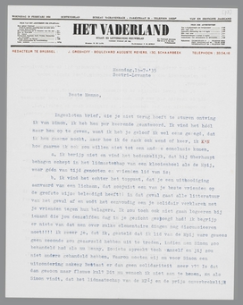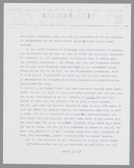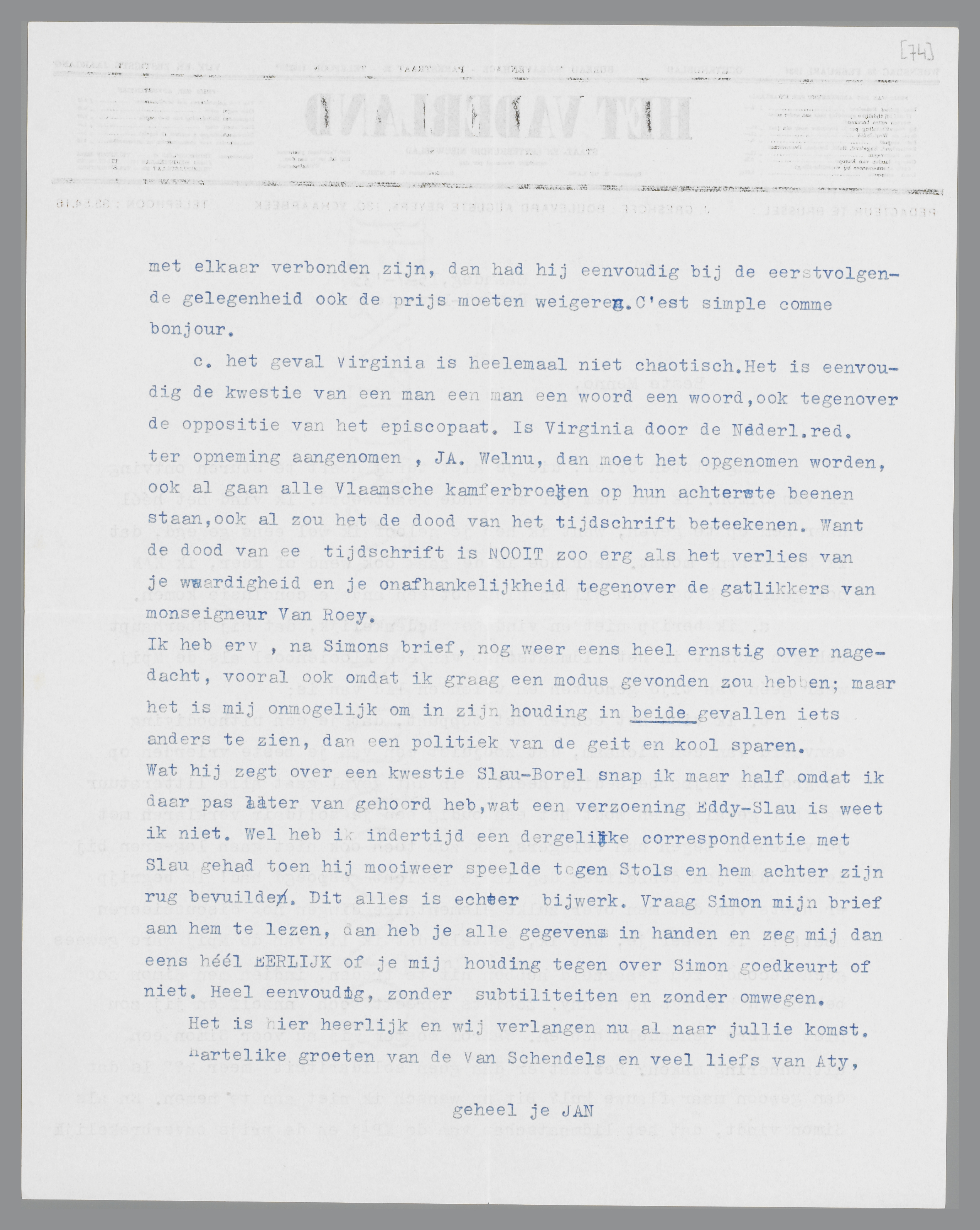 c. het geval Virginia is heelemaal niet chaotisch. Het is eenvoudig de kwestie van een man een man een woord een woord, ook tegenover de oppositie van het episcopaat. Is Virginia door de Nederl. red. ter opneming aangenomen, JA. Welnu, dan moet het opgenomen worden, ook al gaan alle Vlaamsche kamferbroeken op hun achterste beenen staan, ook al zou het de dood van het tijdschrift beteekenen. Want de dood van een tijdschrift is NOOIT zoo erg als het verlies van je waardigheid en onafhankelijkheid tegenover de gatlikkers van monseigneur Van Rooy.