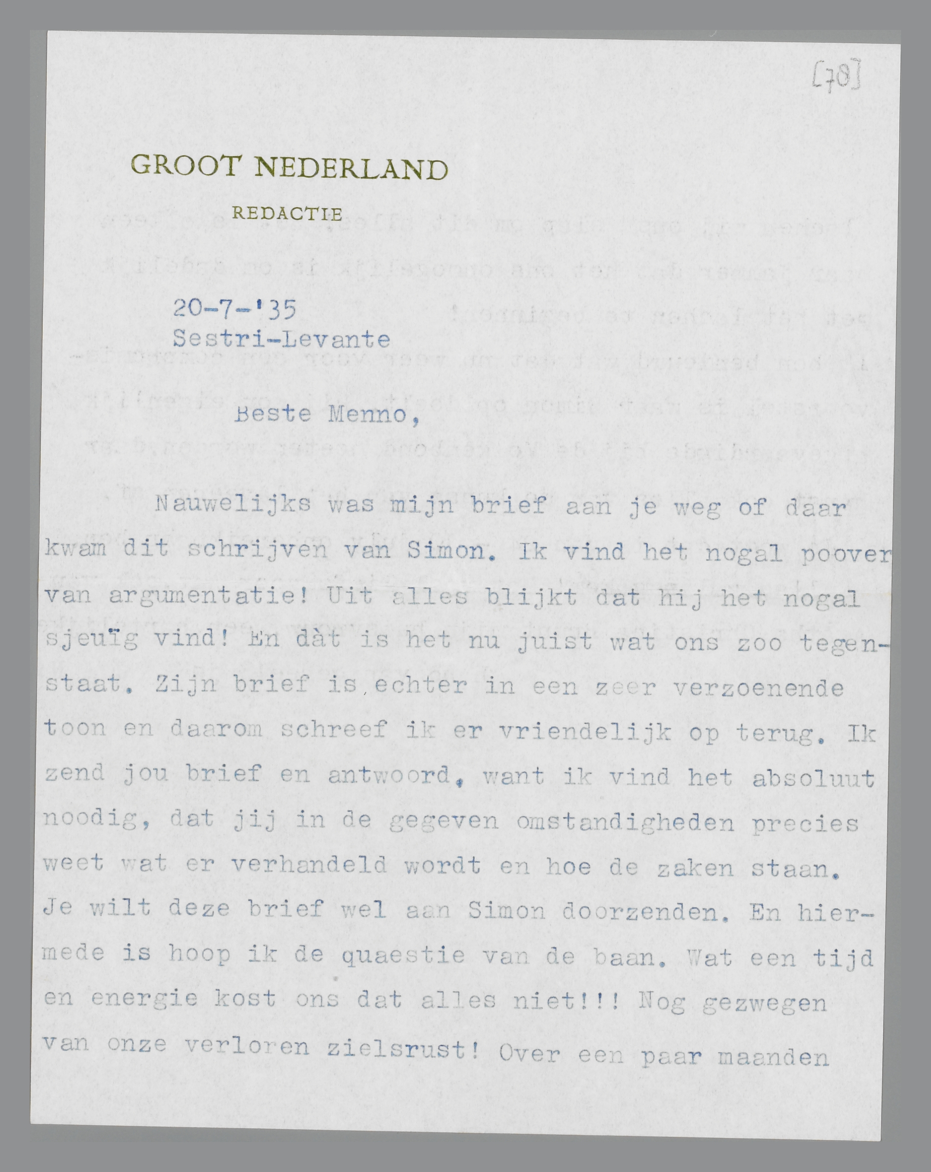 Nauwelijks was mijn brief aan je weg of daar kwam dit schrijven van Simon. Ik vind het nogal poover van argumentatie! Uit alles blijkt dat hij het nogal sjeuïg vind! En dát is het nu juist wat ons zoo tegenstaat. Zijn brief is echter in een zeer verzoenende toon en daarom schreef ik er vriendelijk op terug. Ik zend jou brief en antwoord, want ik vind het absoluut noodig, dat jij in de gegeven omstandigheden precies weet wat er verhandeld wordt en hoe de zaken staan.