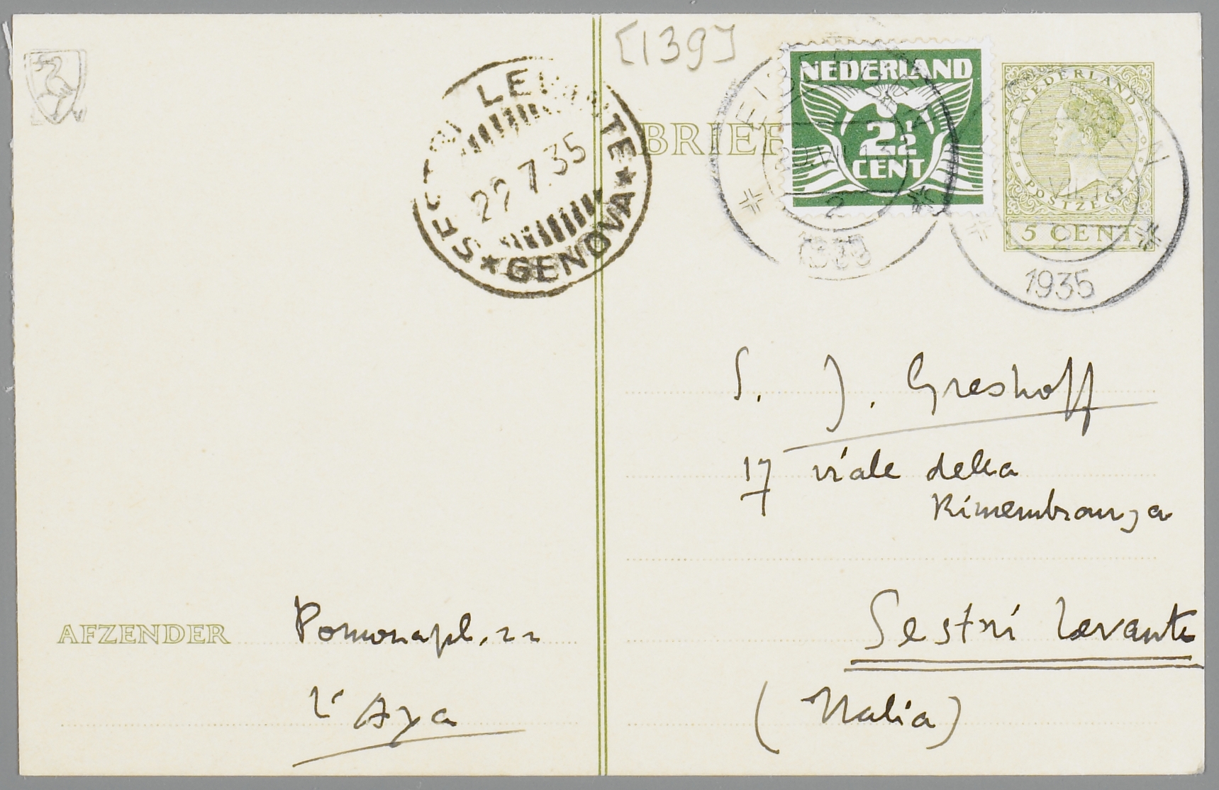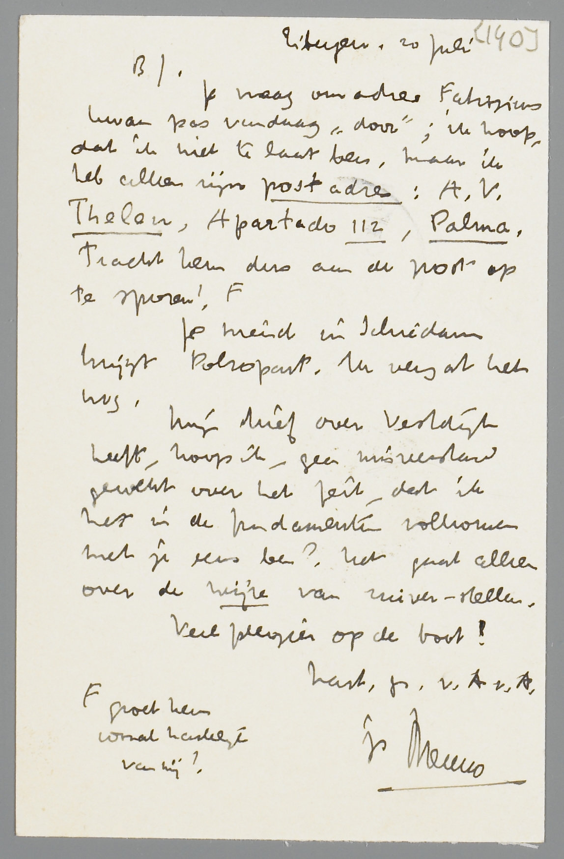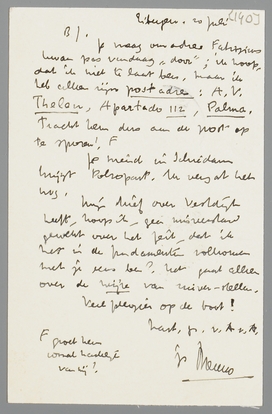 Je vraag om adres Fabricius kwam pas vandaag ‘door’; ik hoop, dat ik niet te laat ben, maar ik heb alleen zijn postadres: A.V. Thelen, Apartado 112, Palma. Tracht hem dus aan de post op te sporen! <groet hem vooral hartelijk van mij!>