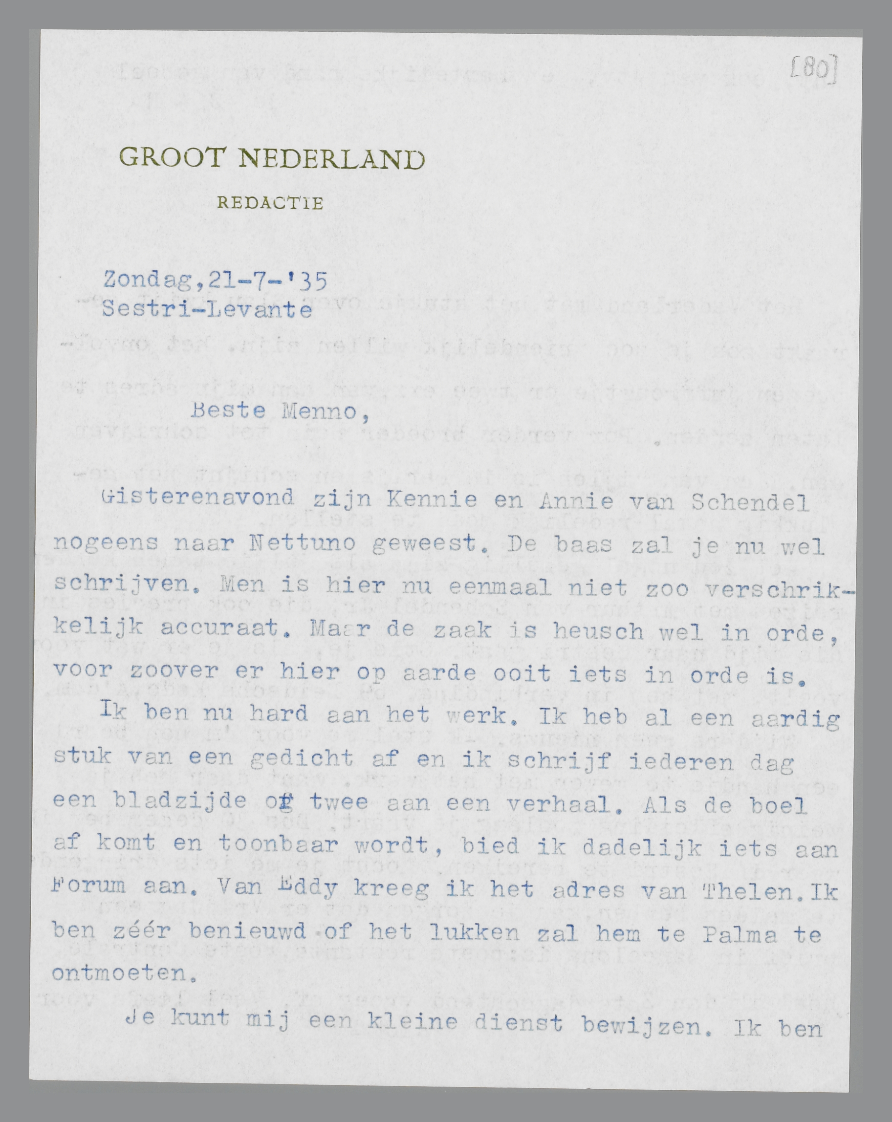 Het zou nogal gezellig zijn als jullie samen konden reizen met Arthur van Schendel Jr, die ook precies in die tijd naar Sestri gaat. Stel je, als je er wat voor voelt, met hem in verbinding. 69 Leidsche Kade, A'dam.