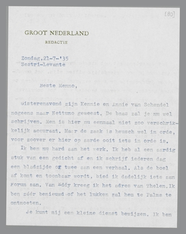 Je kunt mij een kleine dienst bewijzen. Ik ben Het Vaderland met het stukje over Slau kwijtgeraakt zou je zoo vriendelijk willen zijn het onvolprezen juffrouwtje er twee exx. van aan mijn adres te laten zenden. Por verder broeder Hein tot schrijven aan. Jan van Nijlen is in Parijs en schijnt het gelukkig nogal redelijk goed te stellen.