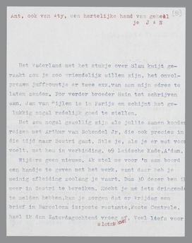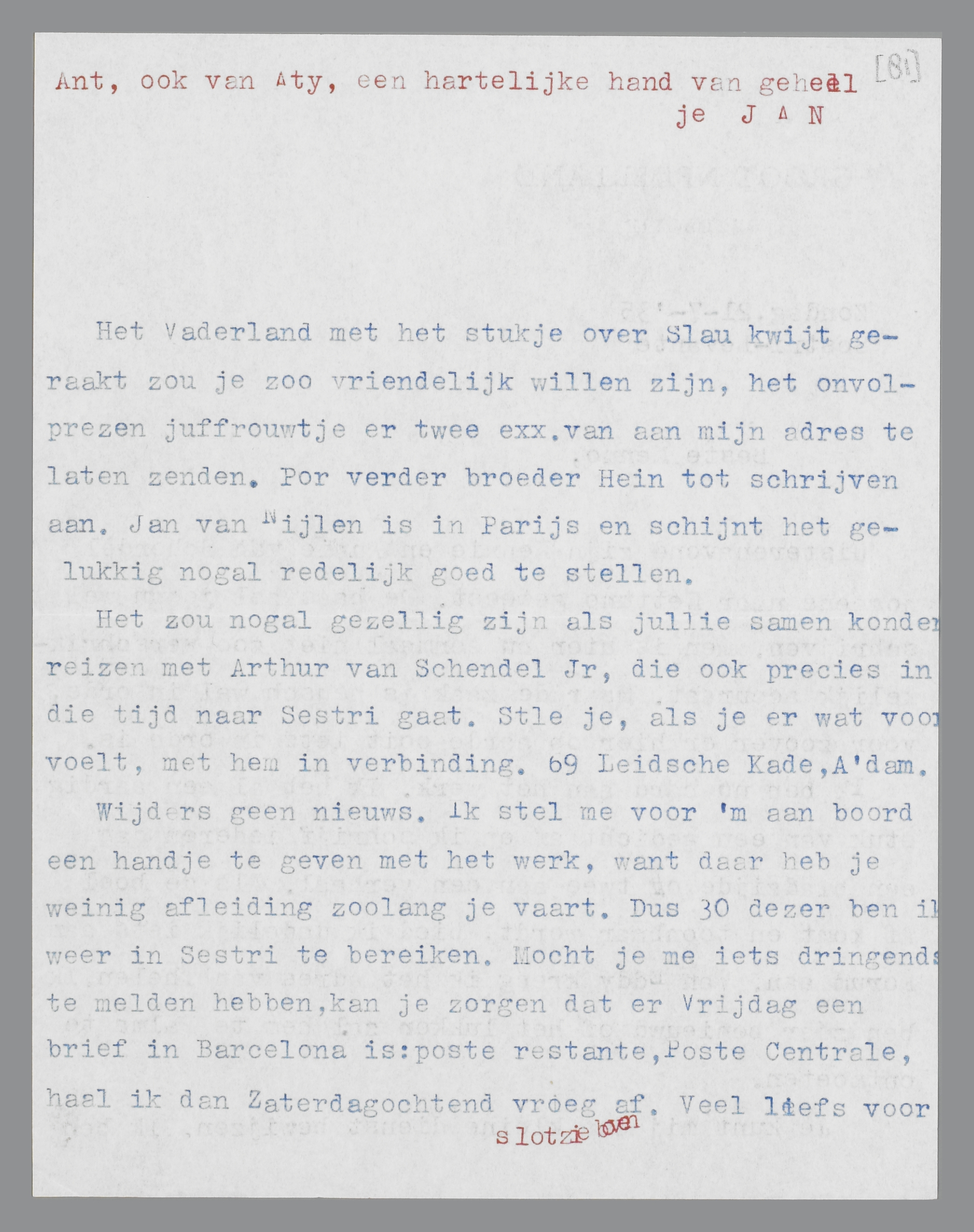 Wijders geen nieuws. Ik stel me voor 'm aan boord een handje te geven met het werk, want daar heb je weinig afleiding zoolang je vaart. Dus 30 dezer ben ik weer in Sestri te bereiken. Mocht je me iets dringends te melden hebben, kan je zorgen dat er Vrijdag een brief in Barcelona is: poste restante, Poste Centrale, haal ik dan Zaterdagochtend vroeg af. Veel liefs voor Ant, ook van Aty, een hartelijke hand van geheel