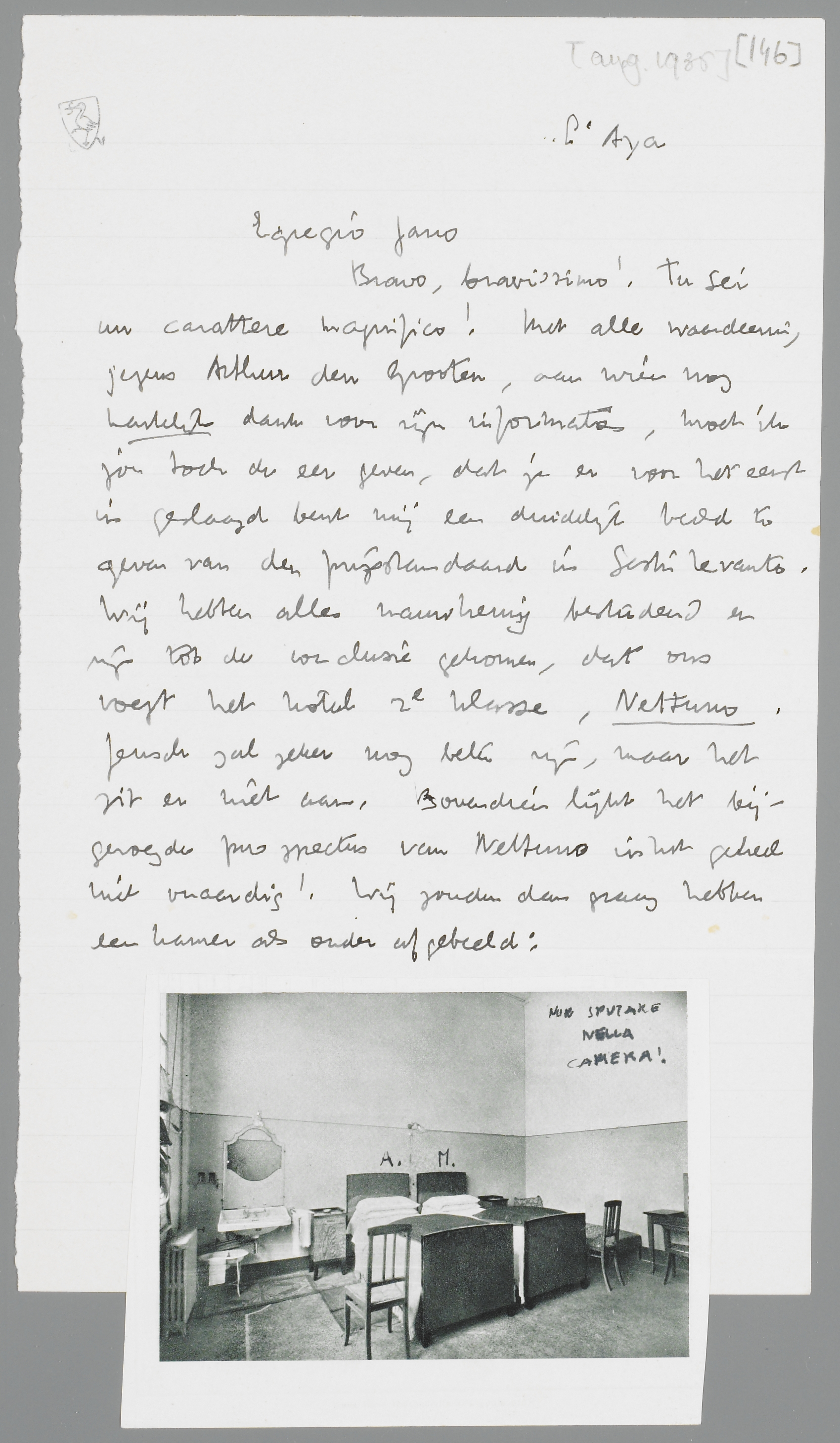 Bravo, bravissimo! Tu sei un carattere magnifico! Met alle waardeering jegens Arthur den Grooten, aan wien nog hartelijk dank voor zijn informaties, moet ik jou toch de eer geven, dat je er voor het eerst in geslaagd bent mij een duidelijk beeld te geven van den prijsstandaard in Sestri Levante. Wij hebben alles nauwkeurig bestudeerd en zijn tot de conclusie gekomen, dat ons voegt het hotel 2e klasse, Nettuno. Jensch zal zeker nog beter zijn, maar het zit er niet aan. Bovendien lijkt het bijgevoegde prospectus van Nettuno in het geheel niet onaardig! Wij zouden dan graag hebben een kamer als onder afgebeeld:
